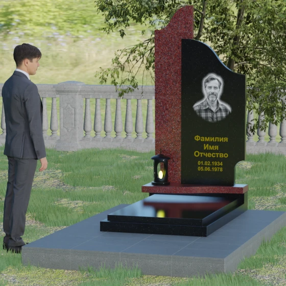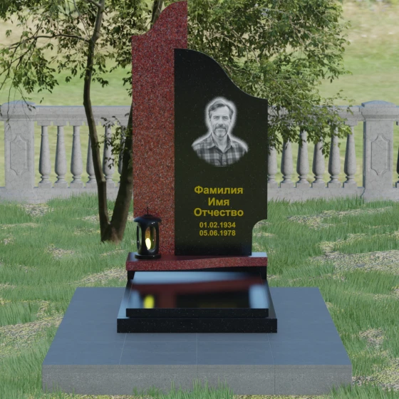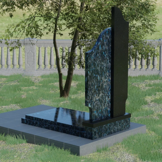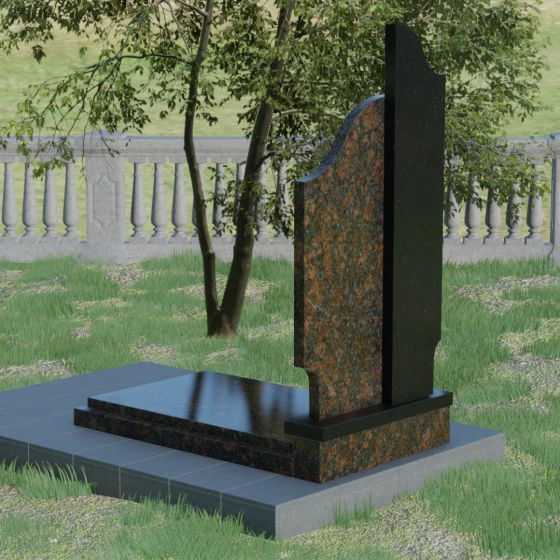 Данная мемориальная композиция представляет собой сложный архитектурный ансамбль, в основе которого лежит игра геометрических форм и контрастных фактур. Основная стела состоит из двух вертикальных элементов разной высоты и конфигурации, что создает динамичный и в то же время уравновешенный силуэт. Левая часть стелы выполнена с мягким, волнообразным изгибом, напоминающим спокойное течение времени или уходящий за горизонт путь. Правая часть — более высокая, узкая и статная, с асимметричным «рваным» навершием, которое символизирует возвышенность духа и незыблемость памяти. Такое сочетание плавности и резкости делает это надгробие из натурального камня универсальным решением, способным передать как нежность утраты, так и твердость характера ушедшего человека.
