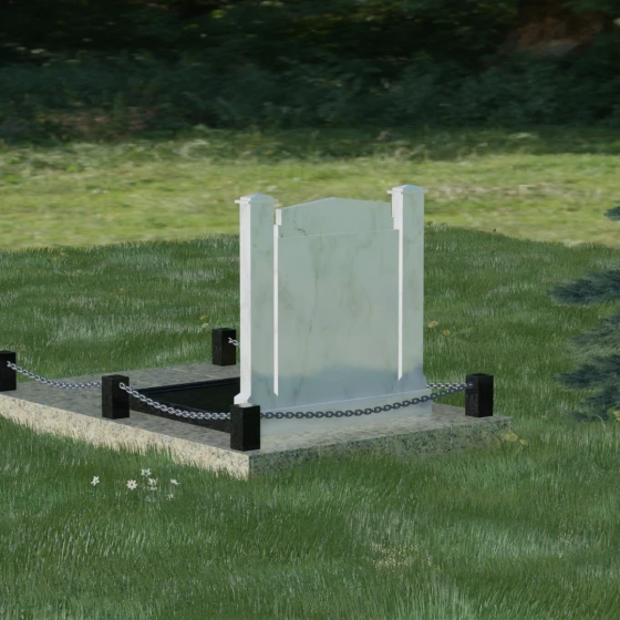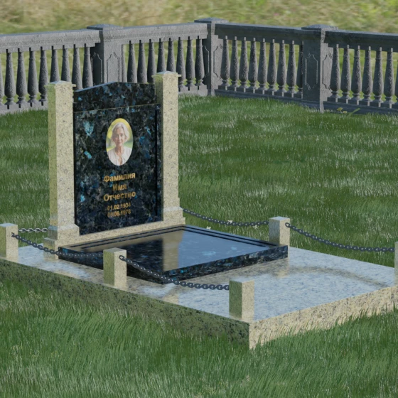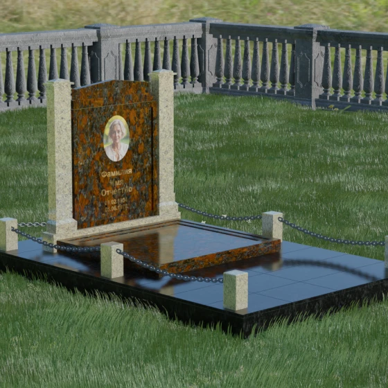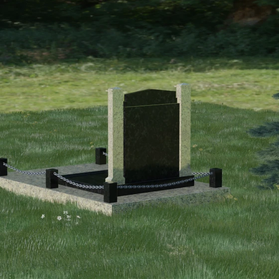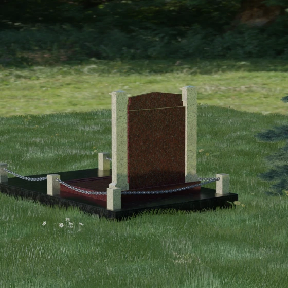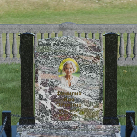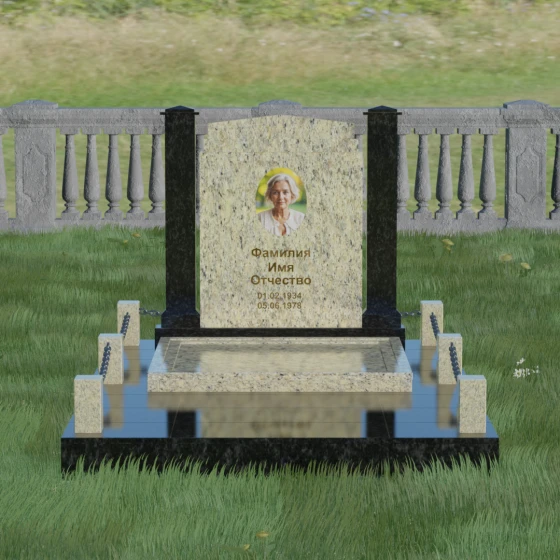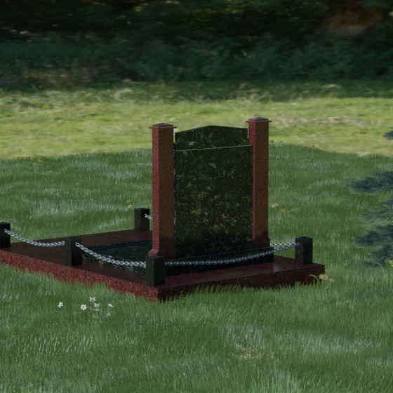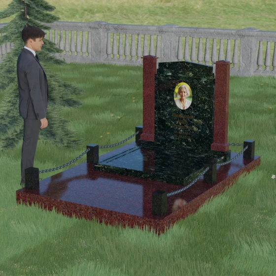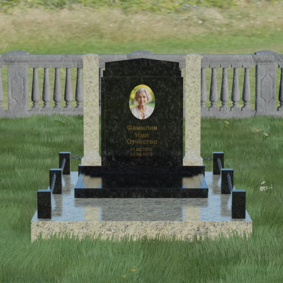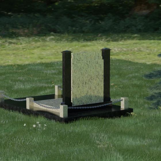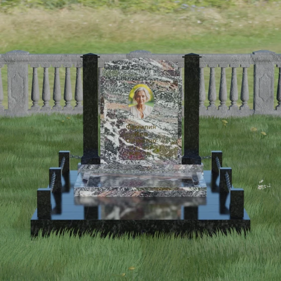 Главной особенностью данного комплекса являются две декоративные колонны, обрамляющие центральную стелу. Эти стройные вертикальные столбы не просто дополняют дизайн, но и служат символом опоры, духовной стойкости и незыблемости памяти. Контрастное сочетание фактур и цветов, представленное в разных вариациях модели, позволяет расставить акценты: выделить центральную часть для портрета или, наоборот, подчеркнуть строгость боковых пилонов. Зеркальная полировка каждой грани создает удивительную игру света — поверхность камня отражает мир вокруг, словно запечатлевая в себе само течение времени, при этом сохраняя безупречный блеск на многие десятилетия.