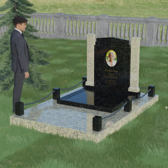 Особого внимания заслуживает полное благоустройство участка, входящее в концепцию модели 011. Памятник устанавливается на массивный гранитный цоколь, который придает всей конструкции устойчивость и защищает её от сезонных подвижек грунта. Вместо открытого цветника здесь используется сплошная надгробная плита, закрывающая всю площадь захоронения. Это создает эстетически законченный, строгий вид и значительно упрощает уход за могилой — вам не придется бороться с сорняками или обновлять засыпку. Завершают композицию аккуратные каменные столбики с декоративными цепями, которые обозначают границы частного пространства, создавая атмосферу уединения и покоя.