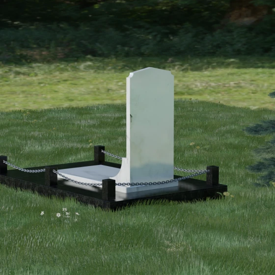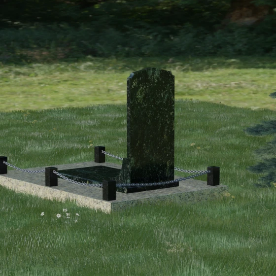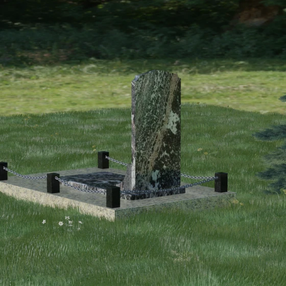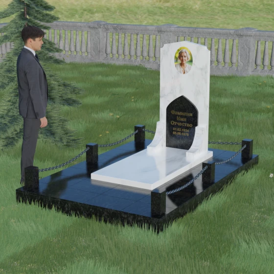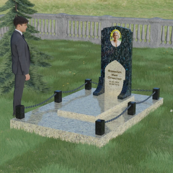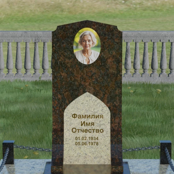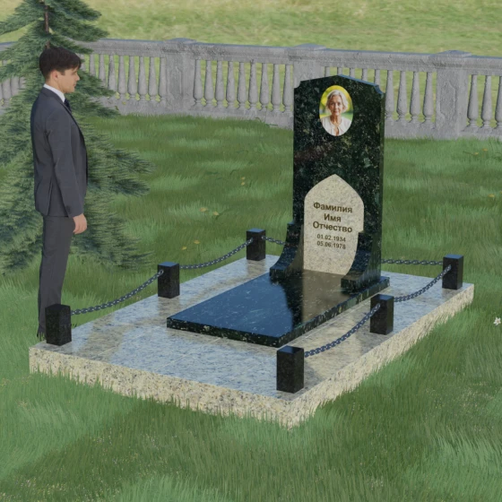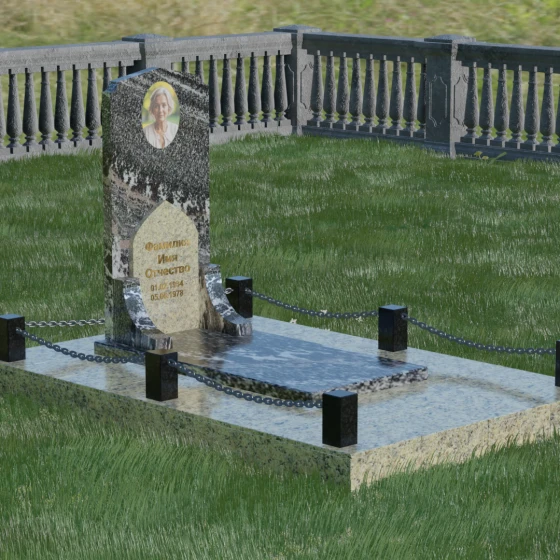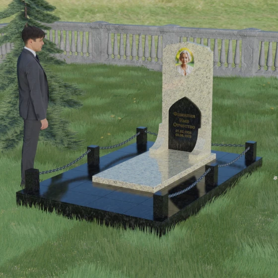 Геометрия стелы идеально приспособлена для размещения портрета в верхней части. Овальный медальон, расположенный по центру, визуально уравновешивает композицию, находясь над «аркой» с текстом. Золоченая гравировка на светлом фоне арки читается легко и четко даже с расстояния. Завершенность участку придают массивные гранитные столбики, соединенные тяжелыми декоративными цепями. Это ограждение не загромождает пространство, но четко обозначает границы частной территории, создавая атмосферу уединения и защищенности. Каждая деталь — от формы фаски на столбиках до надежных креплений цепей — продумана мастерами-камнерезами для того, чтобы мемориал стал достойным воплощением вашей любви и незыблемой памяти на долгие века.
