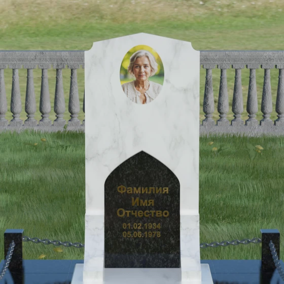 Данное надгробие из натурального камня представляет собой архитектурный ансамбль, в котором строгость линий гармонично сочетается с мягкостью художественных акцентов. Визуальный центр композиции — сложная вертикальная стела, выполненная в технике комбинирования двух контрастных пород. Основное полотно из темного, зеркально отполированного камня служит благородным фоном, на котором особенно выразительно смотрится светлая фигурная вставка. Эта вставка, имеющая форму стрельчатой арки, словно открывает «портал» памяти, создавая чистую и светлую зону для нанесения имен и памятных дат. Верхняя грань стелы завершается изящным пятигранным сводом, напоминающим очертания храмовой архитектуры, что придает монументу возвышенный и одухотворенный вид. Игра текстур — от глубокого черного глянца до зернистой матовости светлого гранита — создает объем, который меняется в зависимости от угла зрения.