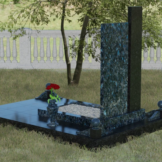 Данное ритуальное изделие представляет собой подлинный образец современного мемориального искусства, в котором строгость архитектурных форм гармонично сочетается с глубоким философским подтекстом. Композиция выстроена на изящном сопоставлении двух вертикальных стел, имеющих разную высоту и фактуру. Асимметричное исполнение символизирует многогранность человеческой жизни: её взлеты и земное завершение. Высокая зеркально-черная стела воплощает собой бесконечность космоса и тишину вечного сна, в то время как примыкающий к ней цветной элемент из благородного камня привносит в ансамбль теплоту земных воспоминаний. Плавные переходы между гранями и безупречная полировка создают ощущение текучести времени, которое застыло в камне, оберегая вечный покой усопшего.