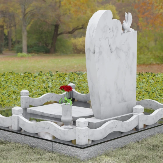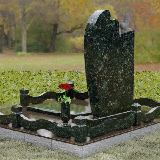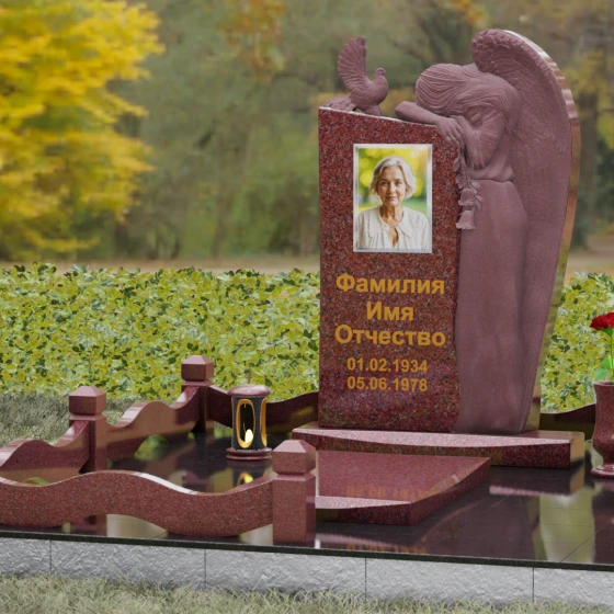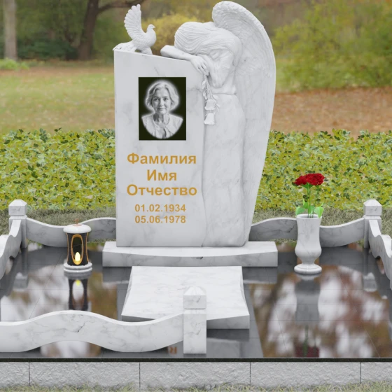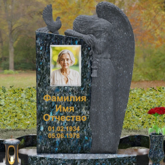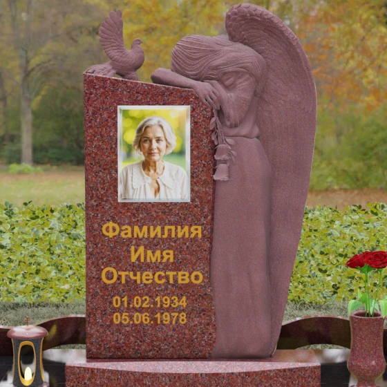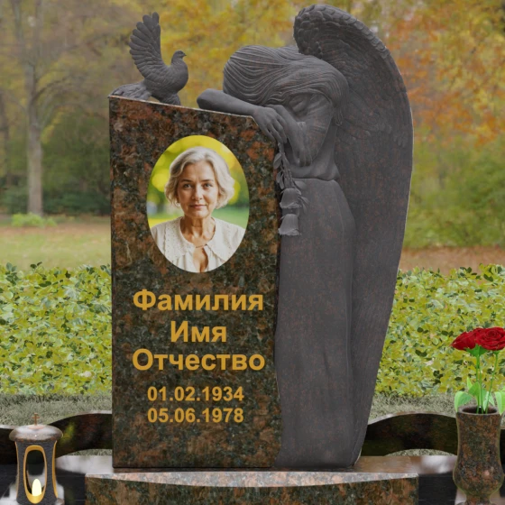 Представленный мемориальный ансамбль (Артикул 129) — это не просто памятный знак, а глубокое архитектурное высказывание, в котором застывшая в камне скорбь обретает форму высокого искусства. Величественная стела доминирует в композиции, представляя собой сложный симбиоз строгой геометрии и филигранной художественной резьбы. Центральным элементом является объемная фигура скорбящего ангела, выполненная в технике глубокого барельефа. Мастерски переданная пластика крыльев с детальной проработкой каждого перышка создает ощущение мягкости, которая парадоксальным образом контрастирует с твердостью натурального камня. Склоненный лик ангела и тонкие складки его одеяний, выполненные в матовом срезе, эффектно выделяются на фоне зеркально полированной поверхности основной плиты. В руках небесного покровителя застыла роза — символ вечной любви, чьи лепестки проработаны с исключительным вниманием к объему и естественности линий.