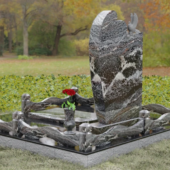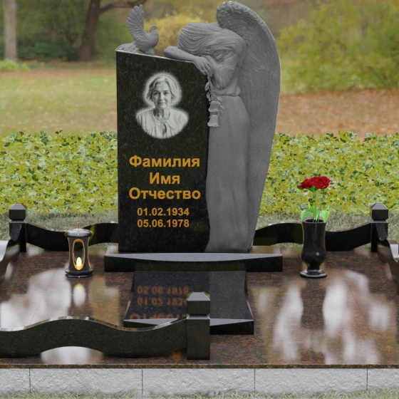 Верхний контур монумента украшен реалистичной фигуркой голубя, символизирующего чистоту души и мир. Композиция выстроена на игре фактур: идеально гладкий, иссиня-черный гранит отражает окружающий мир, в то время как резные элементы имеют благородную шероховатость, подчеркивающую природную суть материала. Форма стелы асимметрична, что придает всему комплексу динамику и современный вид в стиле модерн, сохраняя при этом торжественную монументальность.