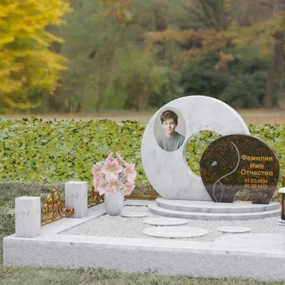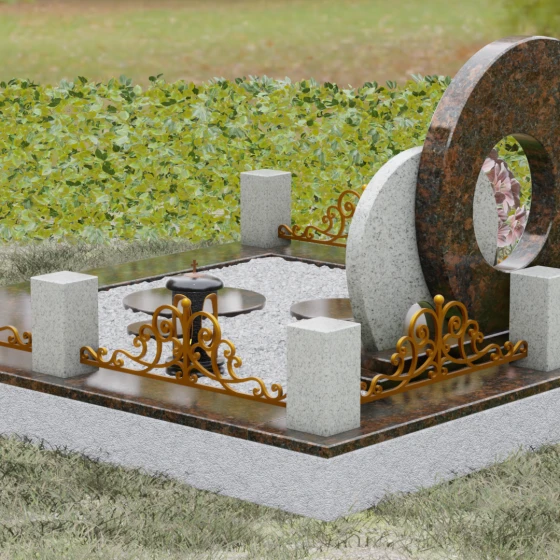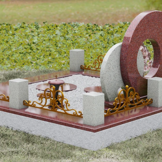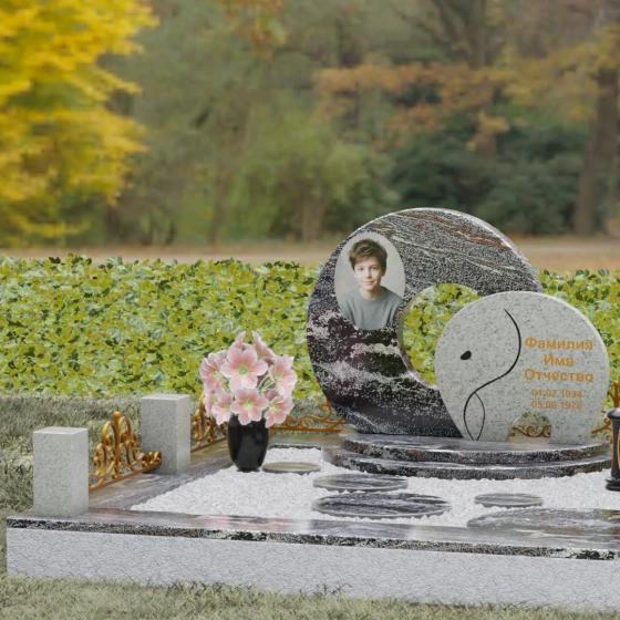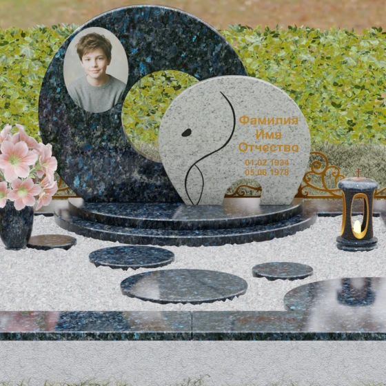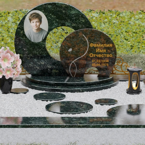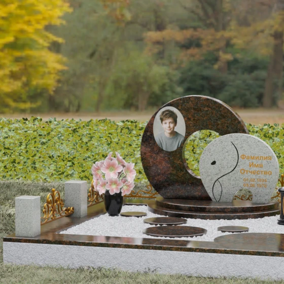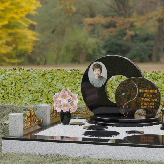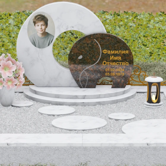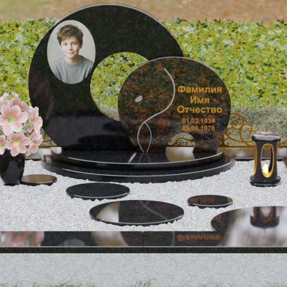 Данная мемориальная композиция (Артикул 134) представляет собой подлинный триумф архитектурной мысли, воплощенный в камне. В центре ансамбля находится величественная стела, состоящая из двух идеально выверенных дисков, которые словно накладываются друг на друга, создавая глубокий символизм бесконечности и цикличности бытия. Геометрия модели лишена острых углов: плавные, скругленные линии подчеркивают гармонию и умиротворение. Основной диск имеет сквозное круглое отверстие, что придает конструкции визуальную легкость и многогранность, в то время как передний сегмент из контрастного камня украшен изящной, лаконичной резьбой. Тонкая, едва уловимая линия художественной гравировки на фронтальной части напоминает стилизованный росток или абстрактный силуэт, подчеркивая индивидуальность мемориала. Массивная конструкция установлена на многоступенчатый круглый подиум, который возвышает монумент над землей, создавая эффект торжественности и непоколебимой надежности.