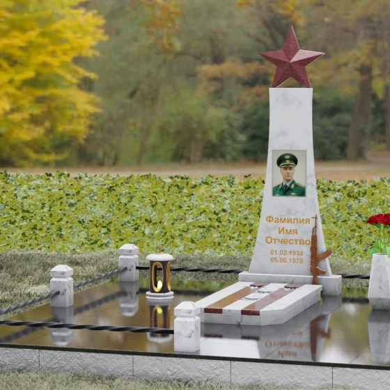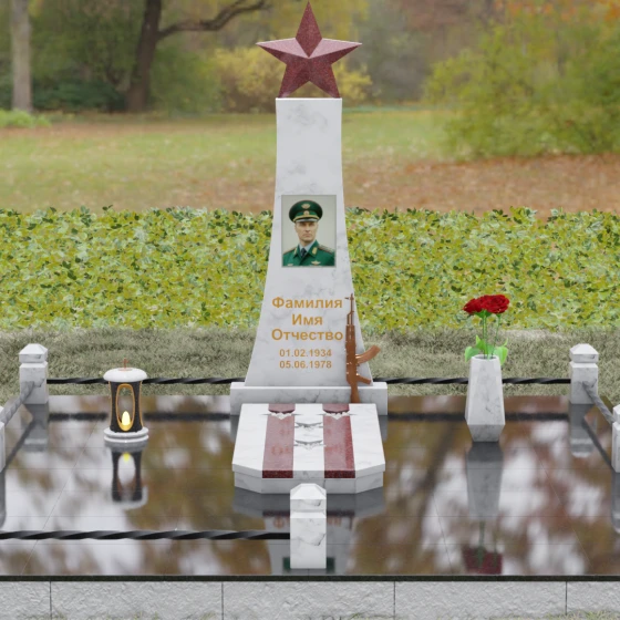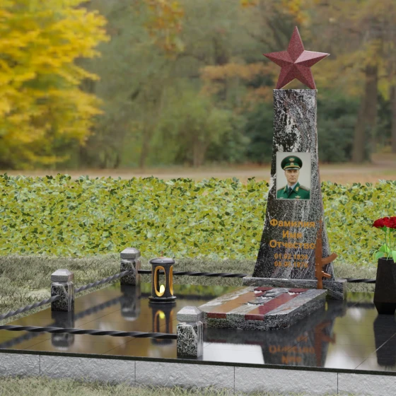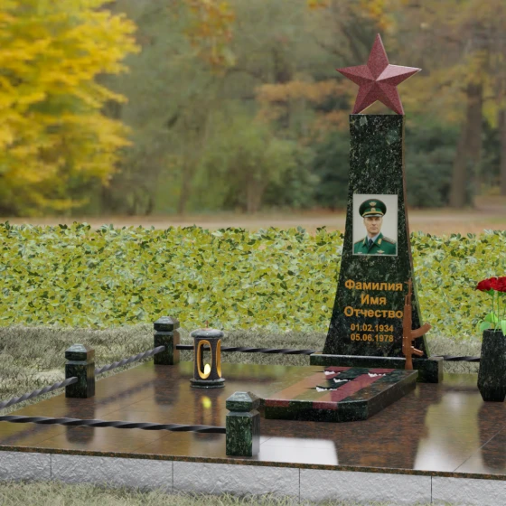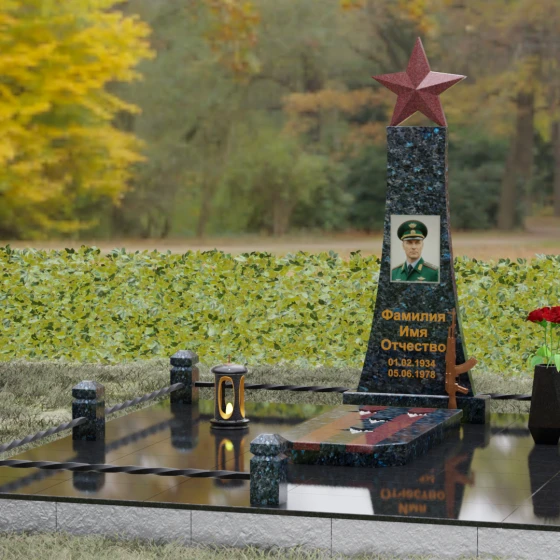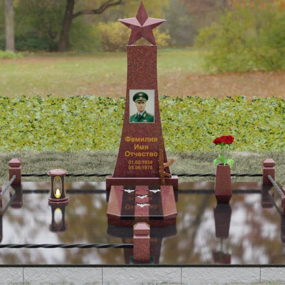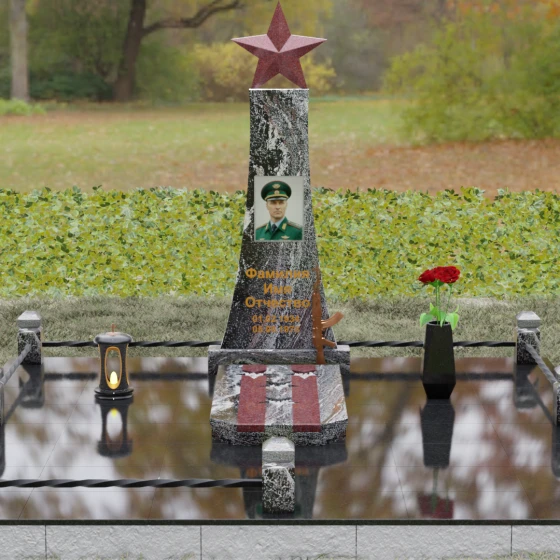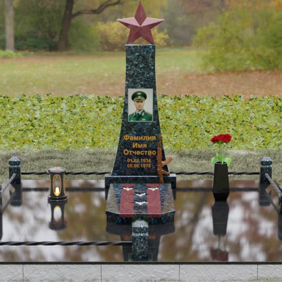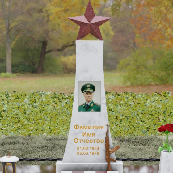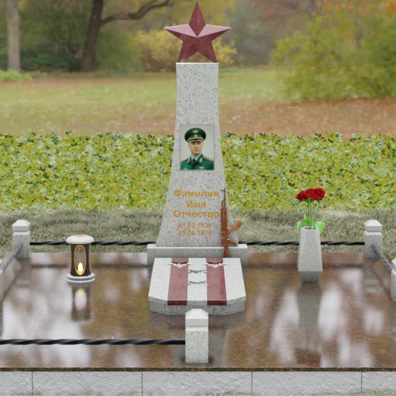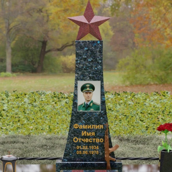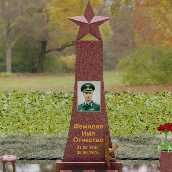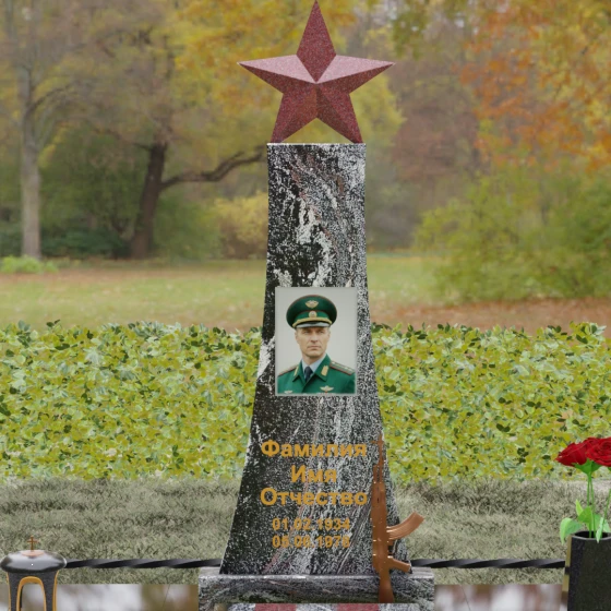 Портрет на данной модели традиционно выполняется в виде прямоугольной керамики или вставки в нишу, что позволяет сохранить фотографическую точность и яркость красок военного мундира на долгие годы. Расположение портрета на центральной оси стелы обеспечивает гармоничную композицию, где взгляд офицера обращен к приходящим. Этот памятник станет достойным финальным аккордом в истории жизни настоящего защитника, воплощая в холодном камне теплоту вашей любви и безграничную гордость за его путь.
