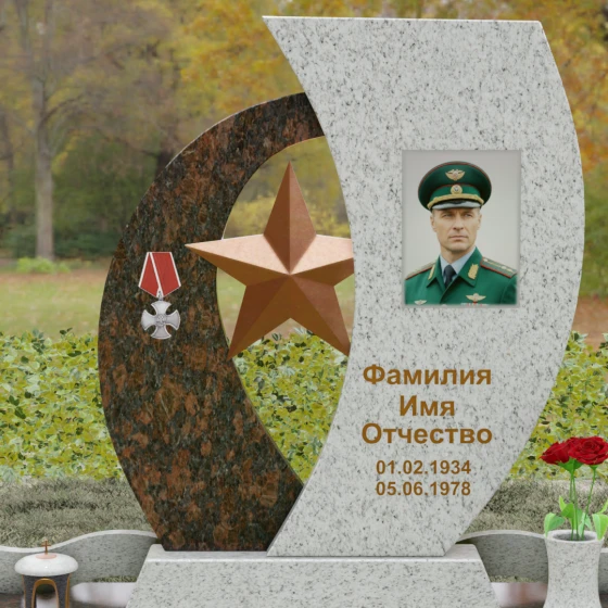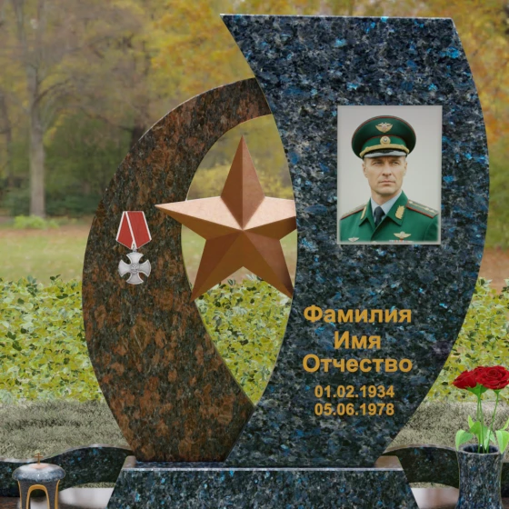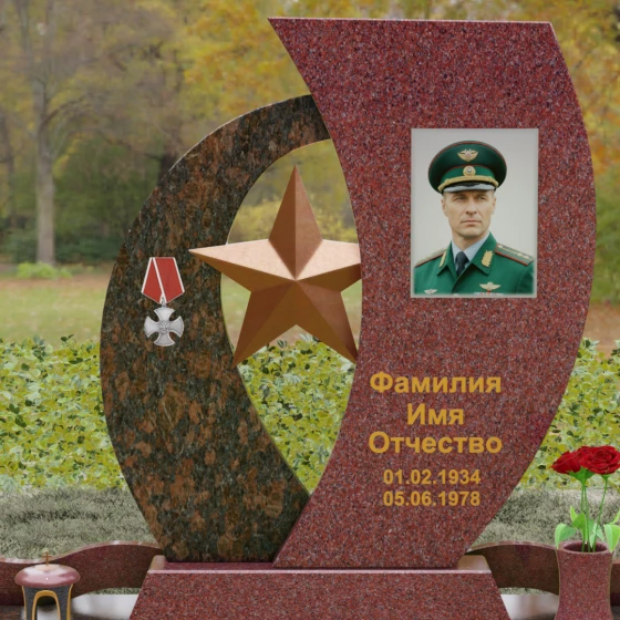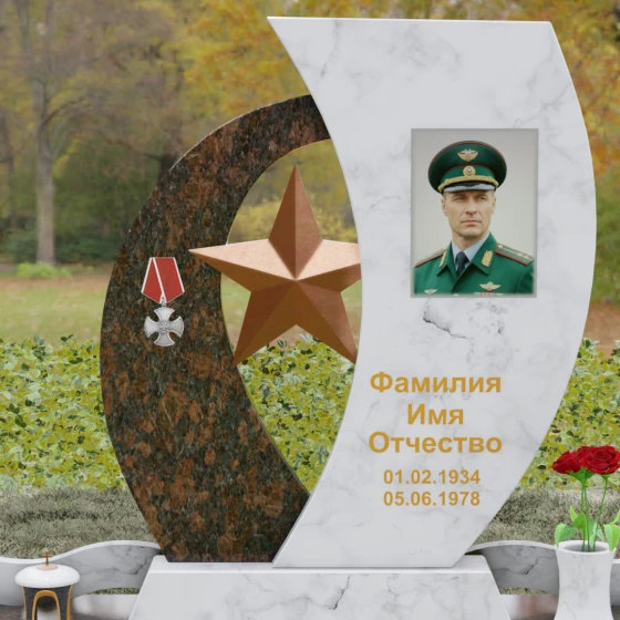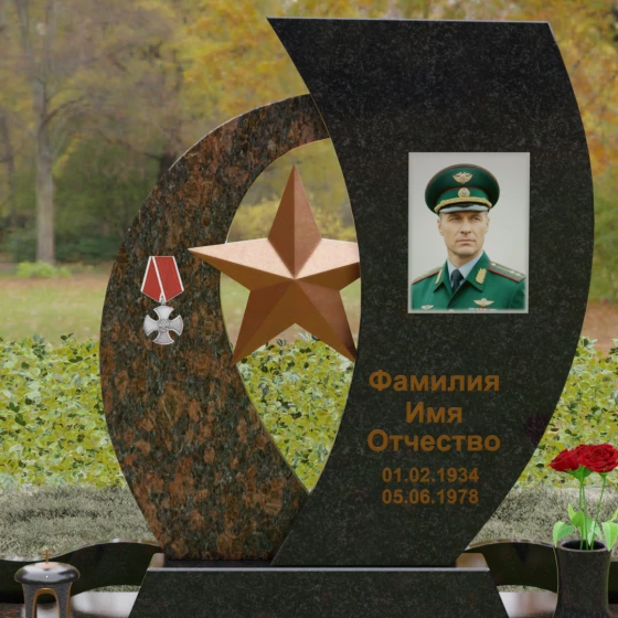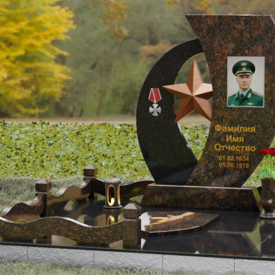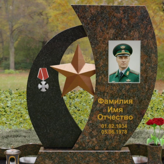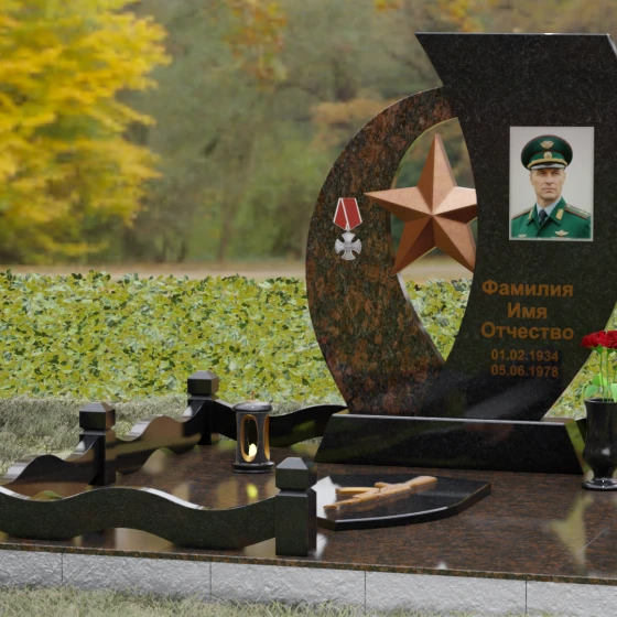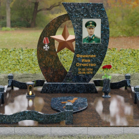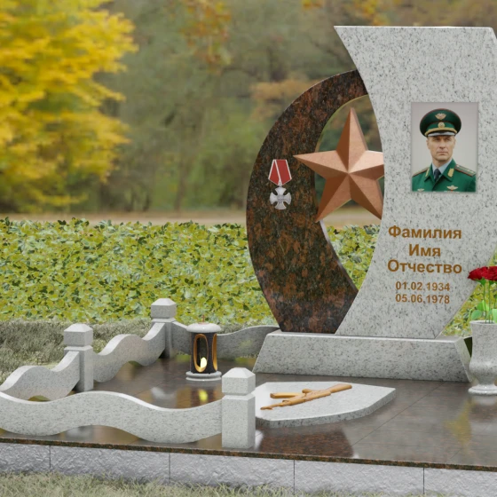Кому подойдет: Данный мемориальный комплекс спроектирован для увековечивания памяти мужчин, чья жизнь была связана с воинским долгом, государственной службой или героическими поступками. Он станет достойным символом последнего пристанища для ветерана, кадрового офицера или человека с твердым характером. Армейская символика в сочетании с изысканным европейским стилем благоустройства (каменная ваза для живых цветов, лаконичная лампада на постаменте) подчеркивает уважение семьи к заслугам и личным качествам дорогого человека.