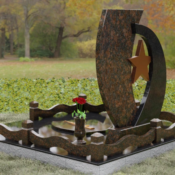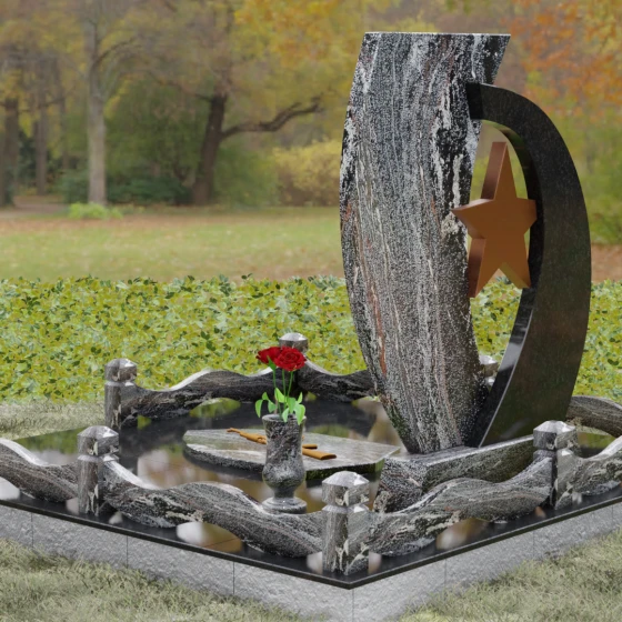 Композиция мемориала построена на динамичном контрасте двух асимметричных стел, которые словно стремятся навстречу друг другу, образуя защитную арку вокруг центрального символа. Левая часть выполнена из насыщенного, текстурированного гранита с выраженным природным рисунком, что олицетворяет сложность и многогранность человеческой судьбы. На этой части расположена детально проработанная резьба в виде медали — знака доблести и чести. Правая часть стелы, имеющая более строгую и вытянутую форму, предназначена для размещения портрета и памятных надписей. Её зеркально отполированная поверхность создает глубокий черный фон, на котором золотая гравировка выглядит особенно благородно.