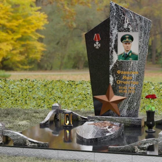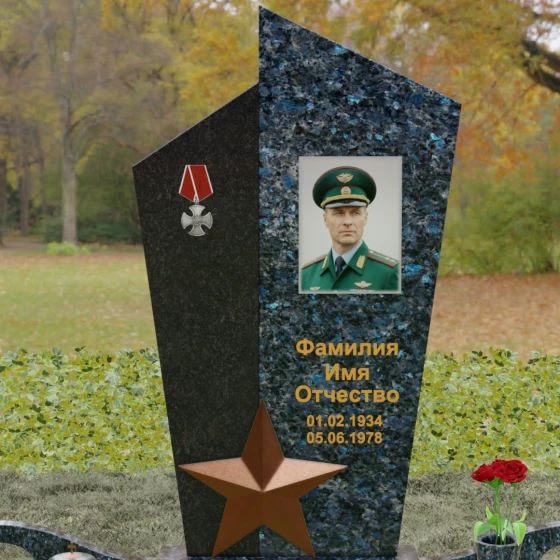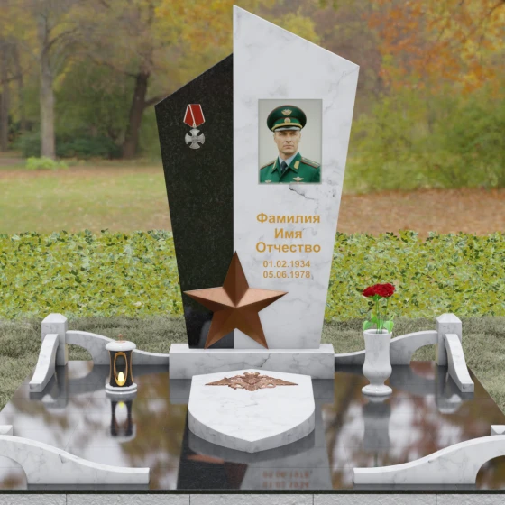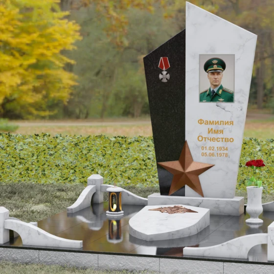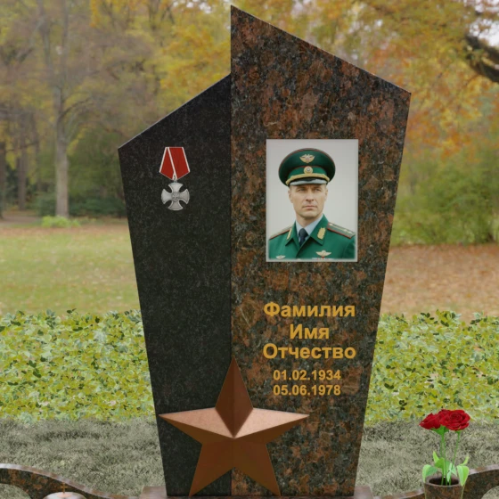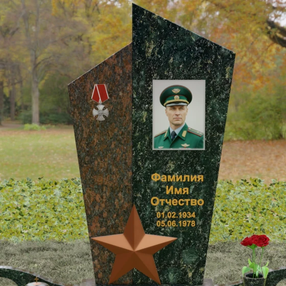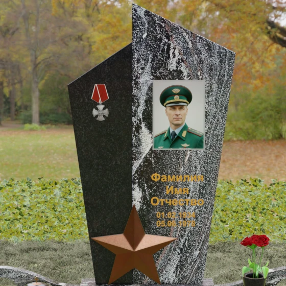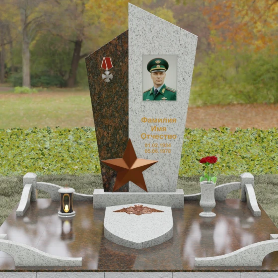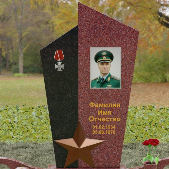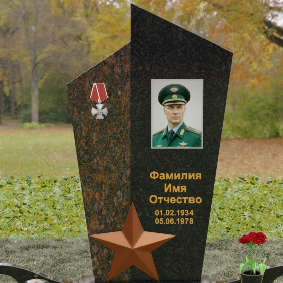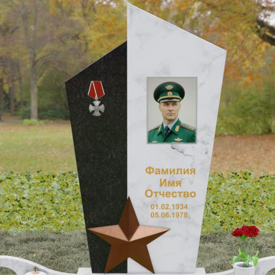 Данная мемориальная композиция представляет собой воплощение архитектурной эстетики и глубокого символизма. Выбор этой модели продиктован её уникальной асимметричной формой, которая отходит от классических канонов в сторону современного монументального искусства. Стела состоит из двух сопряженных сегментов, выполненных в контрастной цветовой гамме, что позволяет подчеркнуть многогранность личности усопшего. Левая часть, обладающая выраженной фактурой натурального камня, служит идеальным фоном для размещения наградной символики, в то время как правая — глубоко черная, зеркально отполированная панель — предназначена для основного портрета и памятных надписей.