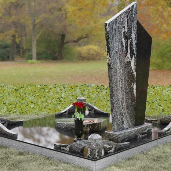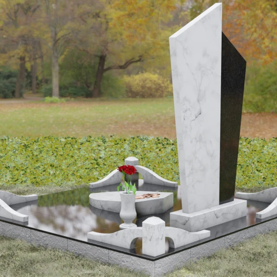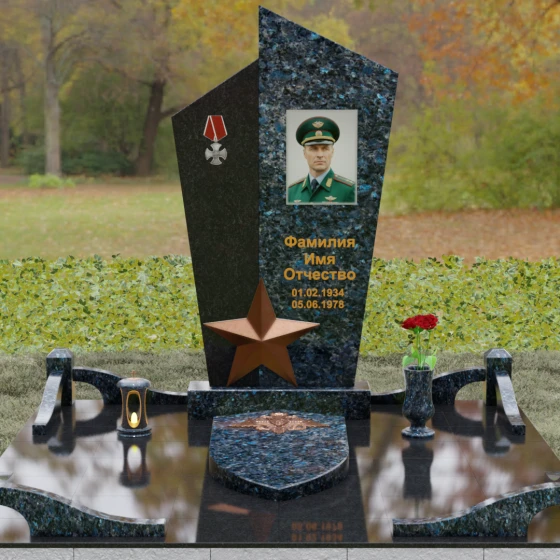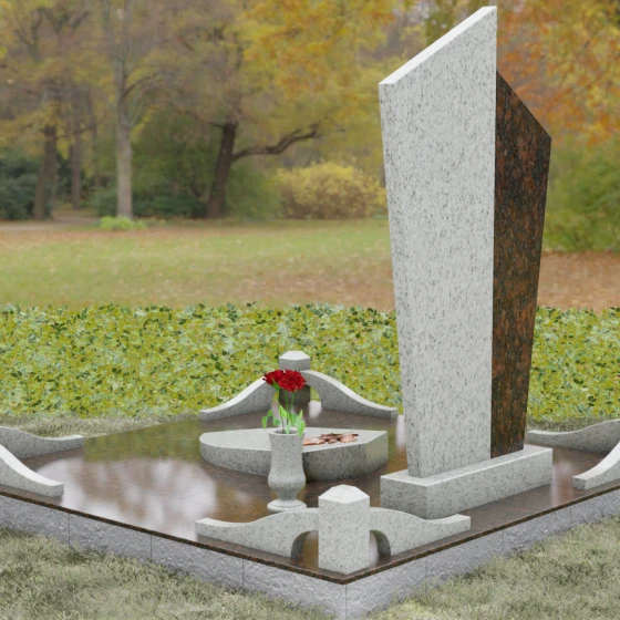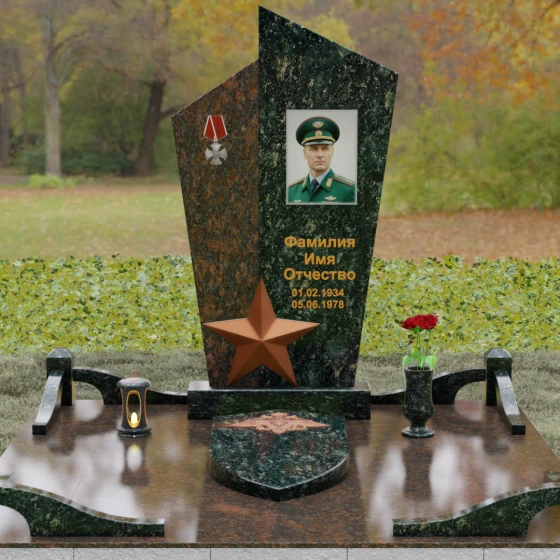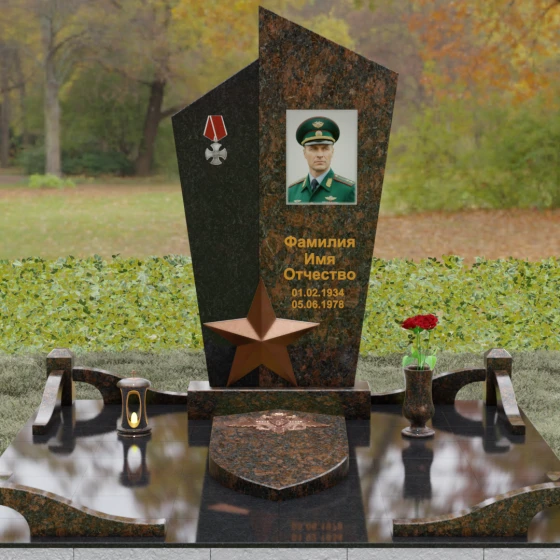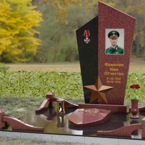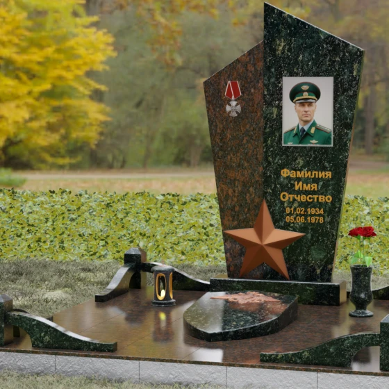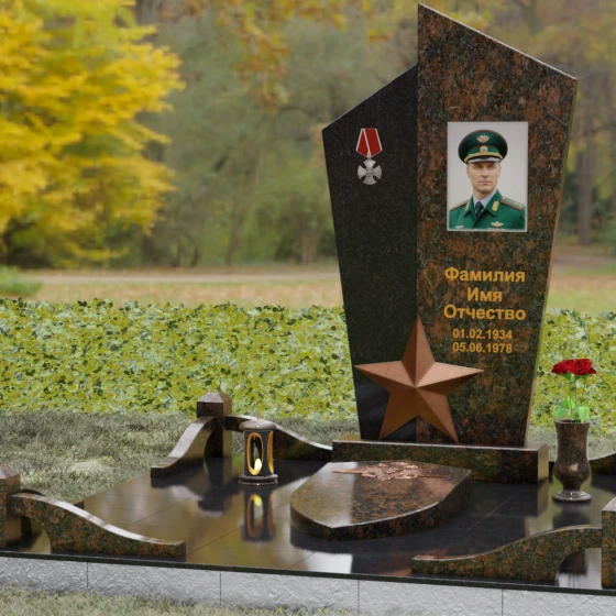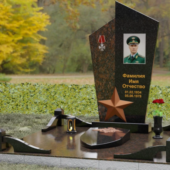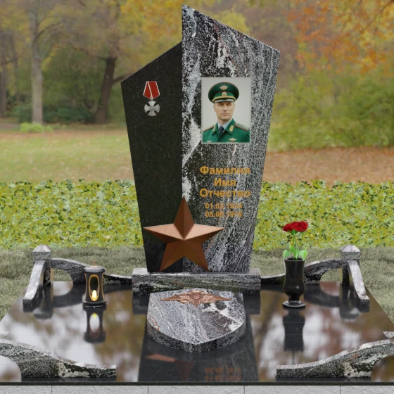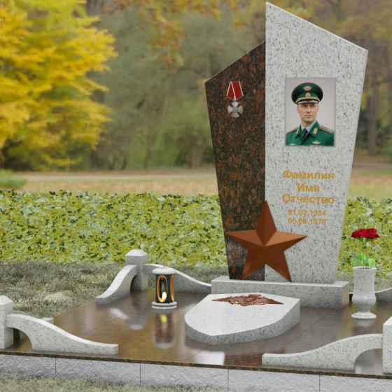 Данная мемориальная композиция представляет собой воплощение архитектурной эстетики и глубокого символизма. Выбор этой модели продиктован её уникальной асимметричной формой, которая отходит от классических канонов в сторону современного монументального искусства. Стела состоит из двух сопряженных сегментов, выполненных в контрастной цветовой гамме, что позволяет подчеркнуть многогранность личности усопшего. Левая часть, обладающая выраженной фактурой натурального камня, служит идеальным фоном для размещения наградной символики, в то время как правая — глубоко черная, зеркально отполированная панель — предназначена для основного портрета и памятных надписей.