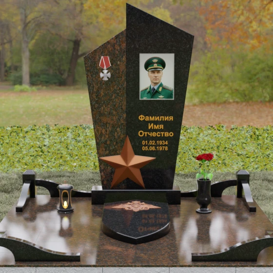 Особое внимание привлекает игра света и тени на полированных гранях. Верхние срезы обелиска выполнены под острым углом, устремляясь ввысь, что создает динамичный и волевой силуэт. Центральным акцентом основания выступает объемная пятиконечная звезда с четкими ребрами, выполненная в благородном бронзовом оттенке. Она не просто дополняет ансамбль, а придает ему трехмерность, становясь смысловым ядром всей структуры. Геометрическая строгость линий и отсутствие лишнего декора подчеркивают мужской характер изделия, транслируя окружающим чувства стойкости и чести.