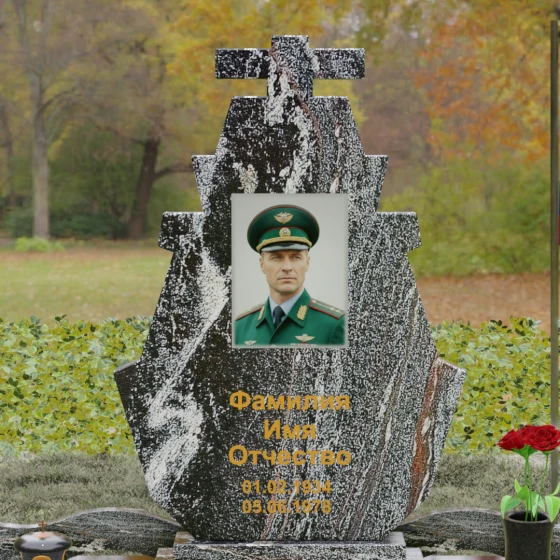 Геометрия стелы диктует свои правила оформления: центральное прямоугольное поле идеально подходит для размещения крупного фотокерамического портрета или классической гравировки. Ниже, под портретом, достаточно места для нанесения фамилии, имени и дат крупным, читаемым шрифтом, который может быть покрыт сусальным золотом или специальной художественной краской для лучшей видимости на фоне камня. Ступенчатая форма памятника сама по себе является мощным декоративным элементом, поэтому она не требует избытка дополнительных рисунков, сохраняя эстетику высокого стиля и сдержанного достоинства.