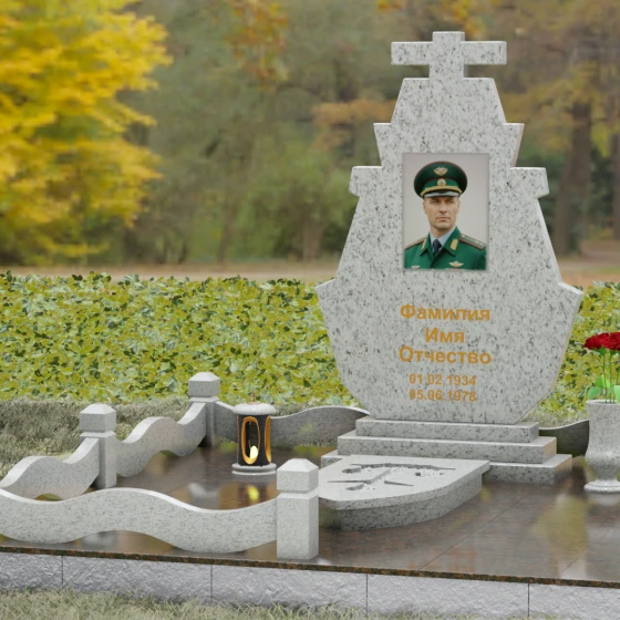 Особое внимание стоит уделить игре фактур, которая раскрывается в деталях резьбы. Центральная часть стелы, предназначенная для портрета и надписей, обладает безупречной зеркальной полировкой. В ней, как в чистом источнике, отражается окружающий мир, создавая ощущение легкости и света. В то же время внутренние углы ступенчатых вырезов и грани креста могут иметь более матовую, бархатистую поверхность, что создает благородный контраст и подчеркивает объемность каждой детали. Этот ансамбль выглядит завершенным благодаря продуманному благоустройству участка. Стела установлена на массивное основание, которое переходит в элегантную декоративную ограду. Столбики с аккуратными фасками и плавно изогнутые, волнообразные перекладины из того же камня очерчивают границы сакрального места, создавая атмосферу уединения. Дополняет композицию изящная каменная ваза, установленная у подножия, позволяя близким выразить свою любовь через живые цветы.