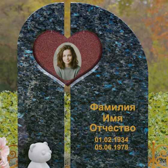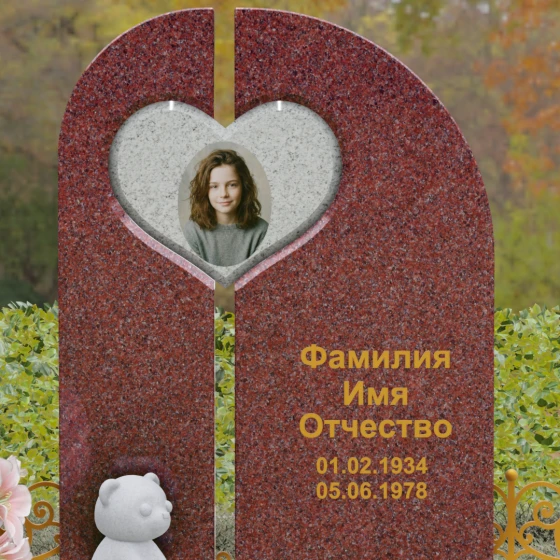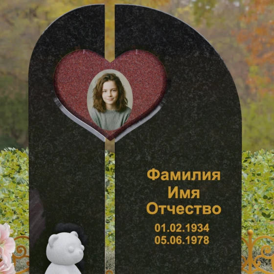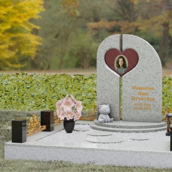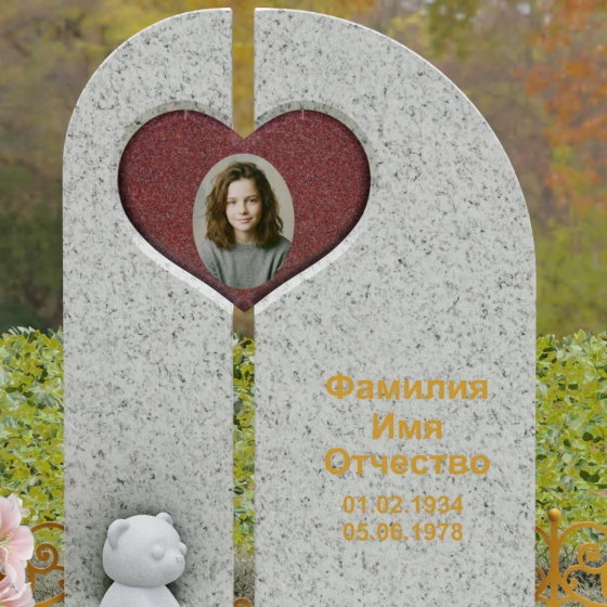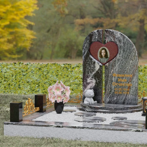 Данный гранитный монумент представляет собой сложную архитектурную композицию, где классические каноны мемориального искусства встречаются с современным европейским стилем. Выбор этой модели обусловлен её глубоким символизмом: центральный элемент выполнен в виде асимметричного полотна с изящным вырезом в форме сердца. Этот художественный прием превращает холодный камень в осязаемое воплощение любви и непреходящей скорби. Плавный изгиб верхней грани и вертикальное разделение основной плиты создают динамичный, но при этом умиротворенный силуэт, который гармонично доминирует над пространством захоронения.