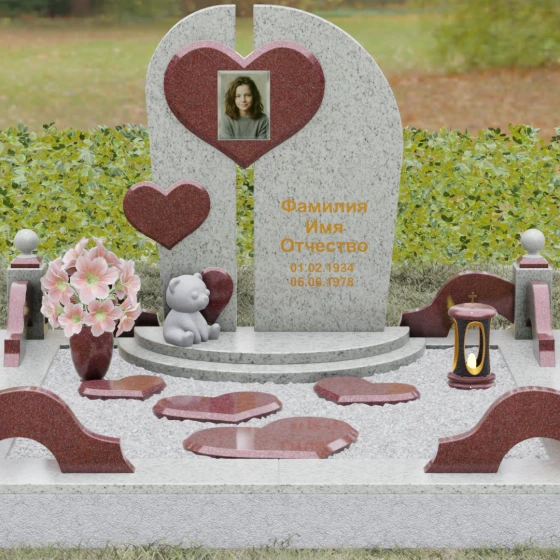 Визуальная концепция модели строится на гармоничном сочетании двух асимметричных вертикальных стел, выполненных из темного камня с безупречной зеркальной полировкой. Центральным элементом композиции является объемное сердце из контрастного красного гранита, которое словно объединяет две половины памятника. В его центре располагается портрет, обрамленный тонкой фаской, что создает эффект драгоценного медальона. Дополнительный акцент вносит второе, меньшее по размеру сердце, закрепленное на левой части стелы, что добавляет динамики и многослойности художественному образу.