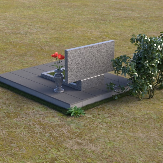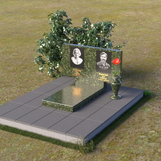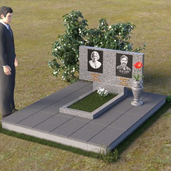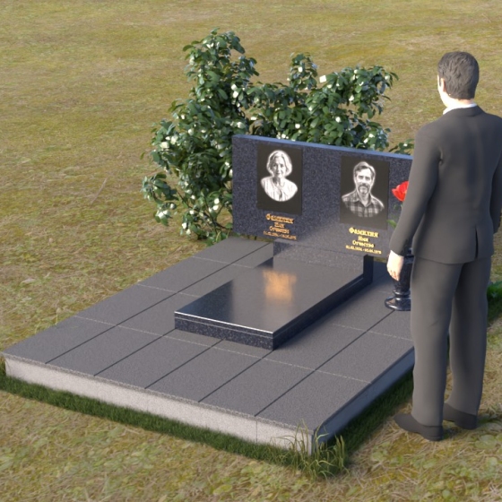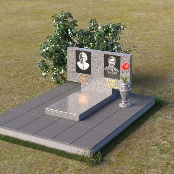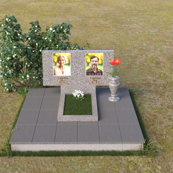 Представленный памятник (артикул ПГ001) являет собой образец строгости и лаконичности, где каждая деталь подчинена общей концепции увековечивания памяти. Композиция состоит из основания, облицованного серыми плитами, горизонтальной плиты, и вертикальной плиты с портретами. Дополнительно предусмотрена тумба для вазы.