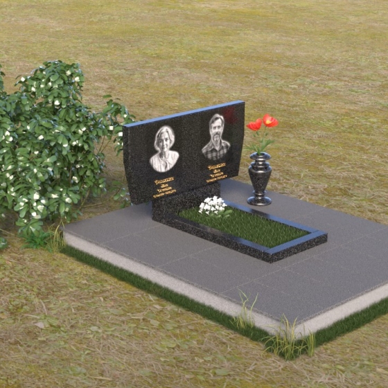 Это ритуальное изделие представляет собой гармоничное сочетание прямых линий и мягких, едва уловимых изгибов, создающих ощущение покоя и умиротворения. Стела имеет прямоугольную форму, но ее верхняя грань слегка скошена, что придает ей визуальную легкость и динамику. Обратите внимание на зеркальную полировку лицевой стороны – она отражает небо и окружающий мир, словно заключая в себе вечность. На полированной поверхности выгравированы портреты усопших и памятные надписи, выполненные с высокой точностью и детализацией. Слева от стелы, на основании, располагается небольшая горизонтальная плита с аналогичной полировкой, создающая дополнительное пространство для цветов или памятных предметов. Основание памятника выполнено из серого камня с матовой фактурой, что создает контраст с блестящей стелой и придает композиции устойчивость и завершенность. Рядом с плитой установлена ваза, выполненная из того же черного полированного гранита, что и стела, что обеспечивает единство стиля и служит достойным обрамлением для живых цветов, символизирующих вечную память.