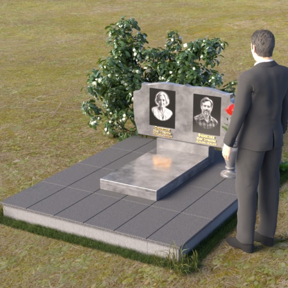 Композиция монумента строится на контрасте плавных линий и строгих геометрических форм. Верхняя часть, несущая на себе портреты усопших, имеет форму, напоминающую раскрытую книгу или свиток, где каждая страница хранит историю жизни. Края этого "свитка" искусно обработаны: верхняя грань словно оплавлена временем, приобретая мягкие, неровные очертания, а боковые стороны имеют более четкий, но все же сглаженный профиль. Фаска, идущая по периметру, придает верхней части визуальную легкость, отделяя ее от основания. Нижняя часть представляет собой прямоугольную плиту с зеркальной полировкой, отражающей небо и окружающий мир, создавая эффект бесконечности и связи с ушедшим. Она словно портал, соединяющий мир живых и мир мертвых, напоминая о непрерывности бытия. Боковины плиты имеют четкую геометрию, подчеркивая основательность и незыблемость памяти.