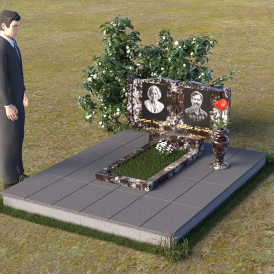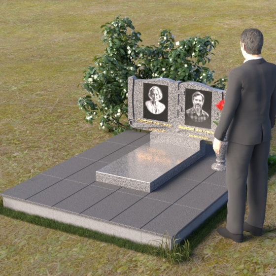 Ритуальное изделие ПГ036 представляет собой сдержанную, но исполненную достоинства композицию, созданную для сохранения памяти о близких. Два прямоугольных элемента стелы, соединенные вместе, образуют волнистый верх, напоминающий раскрытую книгу судеб. Грани обеих частей искусно обработаны, создавая мягкий, обтекаемый силуэт. Зеркальная полировка черного гранита служит идеальным фоном для гравировки портретов и надписей, словно запечатлевая светлые воспоминания в вечном камне. Слева и справа, в верхней части стелы, вырезаны лаконичные кресты, символизирующие веру и надежду. Тонкие линии врезаются в полированную поверхность, создавая игру света и тени, и добавляя глубину изображению. Горизонтальная плита, расположенная перед стелой, выполнена из того же черного гранита с зеркальной полировкой, отражая небо и окружающий пейзаж, создавая ощущение легкости и воздушности. Вместе с тем, основание памятника выполнено из серого камня, что придает всей композиции устойчивость и основательность.