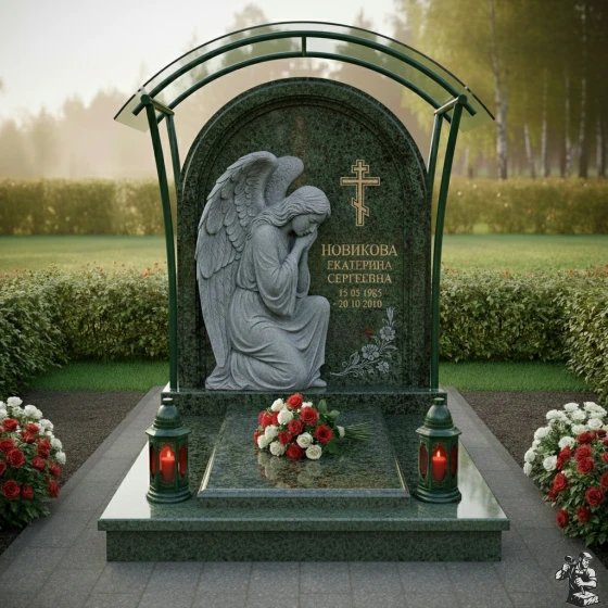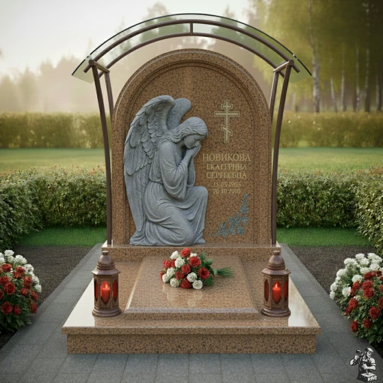 Центральный элемент композиции – стела, выполненная в форме элегантной арки с плавно закругленной вершиной, что придает ей особую мягкость и утонченность. Ее грани обработаны с безупречной точностью, создавая эффект легкого, едва уловимого перехода от полированной поверхности к матовым срезам, подчеркивающим естественную красоту камня. На левой стороне стелы расположена объемная, искусно вырезанная фигура скорбящего ангела. Его крылья, тщательно проработанные до мельчайших перьев, кажется, готовы вот-вот взмыть ввысь, а склоненная голова и сложенные в молитве руки передают глубокое чувство утраты и безмолвной печали. Скульптура выполнена в светлом, контрастном по отношению к основной поверхности камня, оттенке, что создает эффект света и тени, придавая изображению живость и драматизм. На правой стороне стелы выгравирован лаконичный православный крест, возвышающийся над именем и датами жизни усопшего, выполненными в строгом, но изящном шрифте. В нижней части стелы, под датами, расположена тонкая гравировка изящной цветочной ветви, символизирующей нежность и хрупкость жизни. Поверхность стелы имеет глубокую, зеркальную полировку, отражающую свет и создающую ощущение глубины и торжественности.