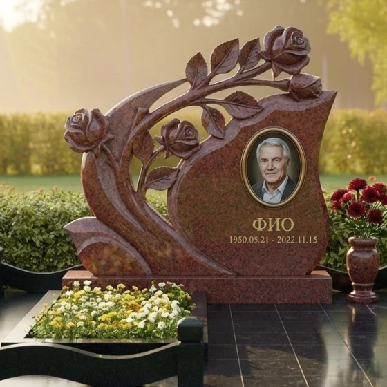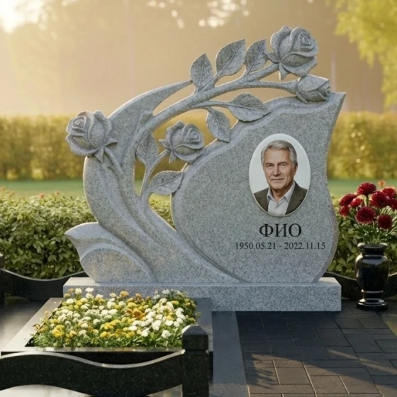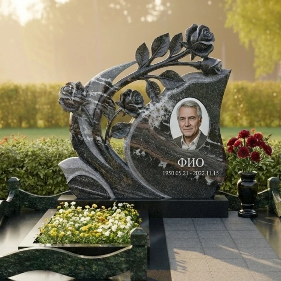 Мемориальная композиция Артикул: ПН 431 представляет собой подлинное произведение искусства, воплощенное в камне. Ее эстетика пронизана глубоким символизмом и изысканной детализацией, призванной увековечить светлую память о человеке. Центральным элементом композиции является стела необычной, динамичной формы, напоминающей развевающееся знамя или раскрывающийся бутон. Ее плавные, изогнутые линии создают ощущение легкости и движения, несмотря на массивность материала. Верхняя часть стелы элегантно изгибается вправо, а левая сторона украшена объемной резьбой в виде ветви розы с распустившимися бутонами. Каждая роза выполнена с поразительной детализацией: лепестки мастерски вырезаны, создавая ощущение их нежности и природной красоты, а бутоны словно вот-вот раскроются, символизируя вечную жизнь и непреходящую любовь. Резные элементы, выполненные в глубоком черном граните, контрастируют с безупречно отполированной основной поверхностью стелы, создавая игру света и тени, подчеркивающую объем и утонченность работы. Этот контраст между зеркальным блеском и матовой глубиной резьбы придает композиции особую выразительность и благородство.