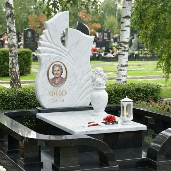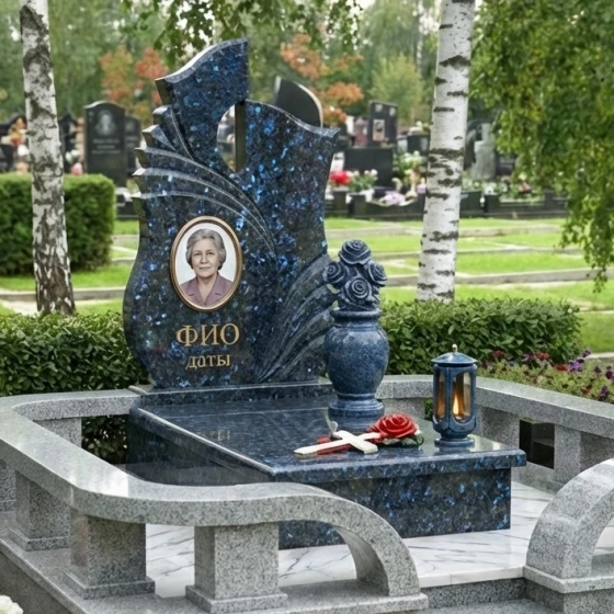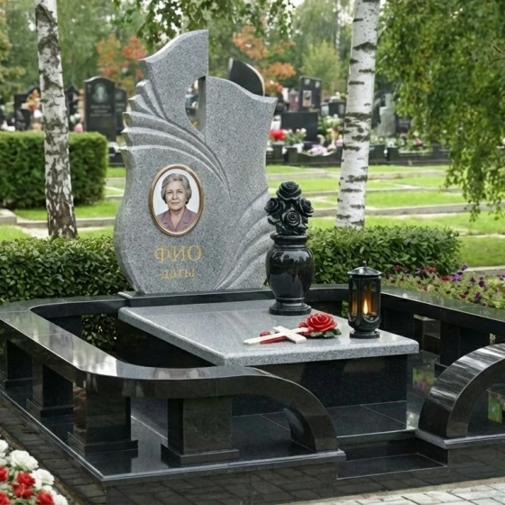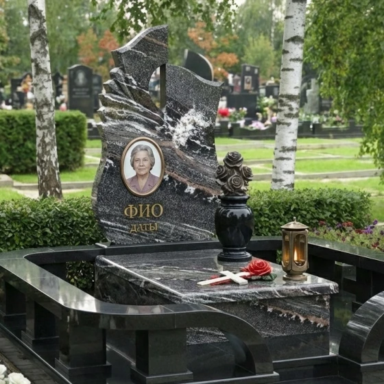 Оформление: Учитывая динамичную форму стелы и наличие резных элементов, мы рекомендуем для портрета использовать классическую овальную или прямоугольную форму, что создаст гармоничный контраст с плавными линиями камня. Гравировка ФИО и дат будет наиболее выигрышно смотреться в классических, хорошо читаемых шрифтах, выполненных с золочением или серебрением, чтобы подчеркнуть торжественность момента и обеспечить долговечность надписи. Мастера готовы предложить индивидуальные эскизы, которые идеально впишутся в выбранный вами камень и форму.
