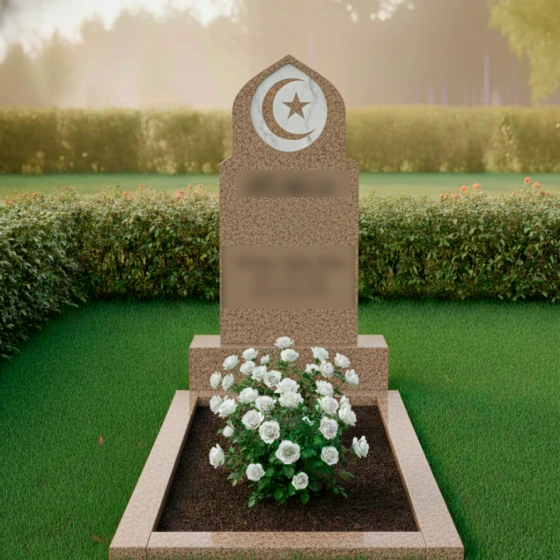 Данный мемориальный ансамбль представляет собой истинное воплощение благородства и духовной глубины. Величественная стела, выполненная в форме традиционного восточного купола или стрельчатой арки, сразу приковывает взгляд своей безупречной геометрией. Главным художественным акцентом композиции является искусно интегрированный медальон из белоснежного мрамора, расположенный в верхней части обелиска. В центре этого светлого круга филигранно вырезаны символы веры — полумесяц и пятиконечная звезда. Контраст между глубоким темным цветом основного камня и матовой чистотой мраморной вставки создает эффект небесного свечения, подчеркивая торжественность и значимость момента памяти. Плавные, но при этом строгие линии резьбы по контуру стелы свидетельствуют о высочайшем уровне камнерезного мастерства, превращая холодный камень в одухотворенное изваяние.