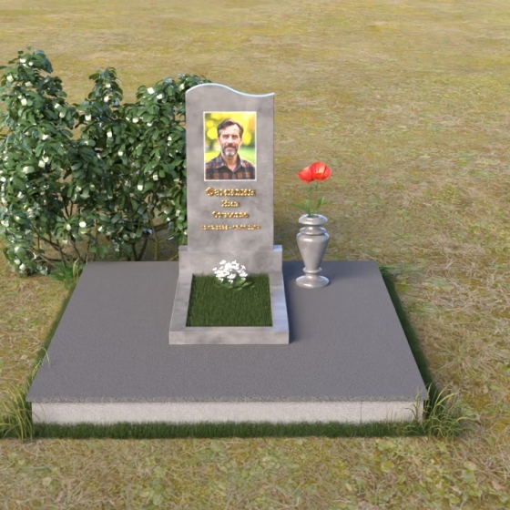 Мемориальная композиция ПВ 010 представляет собой тщательно продуманное архитектурное решение, где каждый элемент несет свою смысловую нагрузку. Стела выполнена в форме строгой, но элегантной арки, с плавным, закругленным верхом, словно стремящимся ввысь. Боковые грани стелы аккуратно скруглены, смягчая строгость формы и придавая ей ощущение спокойствия и завершенности. На лицевой стороне выгравирован портрет усопшего, выполненный с высоким уровнем детализации, а ниже – надпись с именем и датами жизни. Отдельно стоит отметить подставку под стелу. Она имеет прямоугольную форму с зеркальной полировкой, которая отражает небо и окружающий пейзаж, создавая ощущение легкости и воздушности. Скошенные фаски по периметру подставки добавляют ей изысканности и подчеркивают четкость линий.