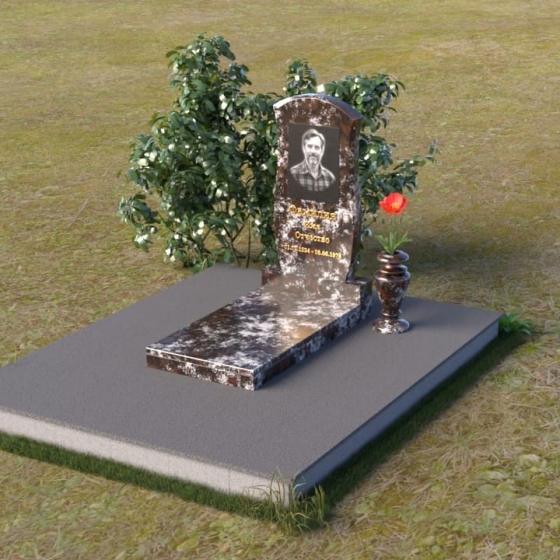 Данная модель предоставляет широкие возможности для индивидуального оформления. Портрет усопшего, выполненный методом гравировки, идеально вписывается в общую композицию, занимая центральное место на стеле. Золотистые буквы надписи, контрастируя с темным фоном полированного гранита, выглядят торжественно и выразительно. Мы рекомендуем выбирать фотографии высокого разрешения для достижения максимальной детализации и реалистичности портрета. Также возможно добавление дополнительных декоративных элементов, таких как эпитафии, религиозные символы или памятные даты. Небольшая подставка, выполненная в том же стиле, что и стела, гармонично дополняет композицию и может служить местом для возложения цветов. Элегантная ваза из черного гранита, расположенная рядом с надгробием, добавляет завершенность образу и позволяет сохранить свежесть цветов на длительное время.
