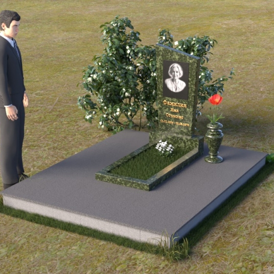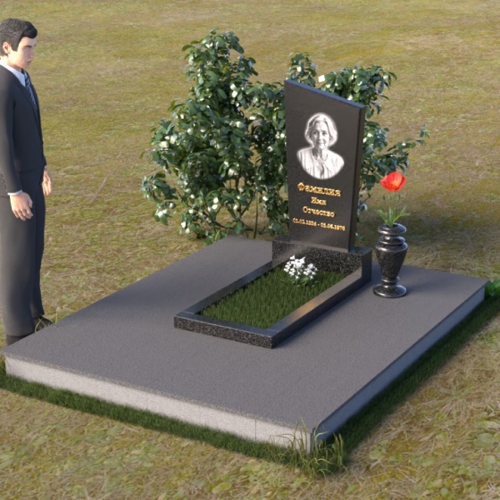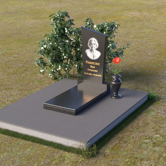 Мемориальная композиция состоит из нескольких элементов, каждый из которых тщательно продуман и выполнен с безупречным качеством. Начинается все с основания – широкой, массивной плиты, которая обеспечивает устойчивость всей конструкции. Её матовая, слегка шероховатая поверхность призвана оттенять блеск полированных элементов, создавая игру фактур и контрастов. Далее взгляд переходит к горизонтальной стеле, расположенной на постаменте. Она выполнена в виде прямоугольника с плавными, скругленными углами, что придает ей мягкость и элегантность. Поверхность стелы отполирована до зеркального блеска, отражая небо и окружающий мир, словно напоминая о связи между земным и небесным. На постаменте возвышается вертикальная стела с портретом и надписью. Верхняя часть стелы имеет скошенный угол, что добавляет динамики и оригинальности всей композиции. На стеле выгравированы имя, фамилия и отчество усопшего, а также даты жизни, выполненные изящным шрифтом. В правом углу композиции расположена ваза, предназначенная для цветов. Её классическая форма и полированная поверхность гармонично дополняют общий стиль мемориала.
