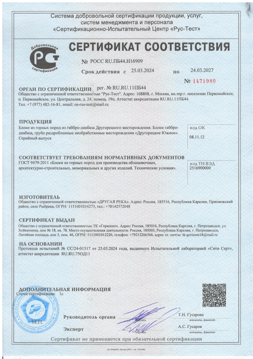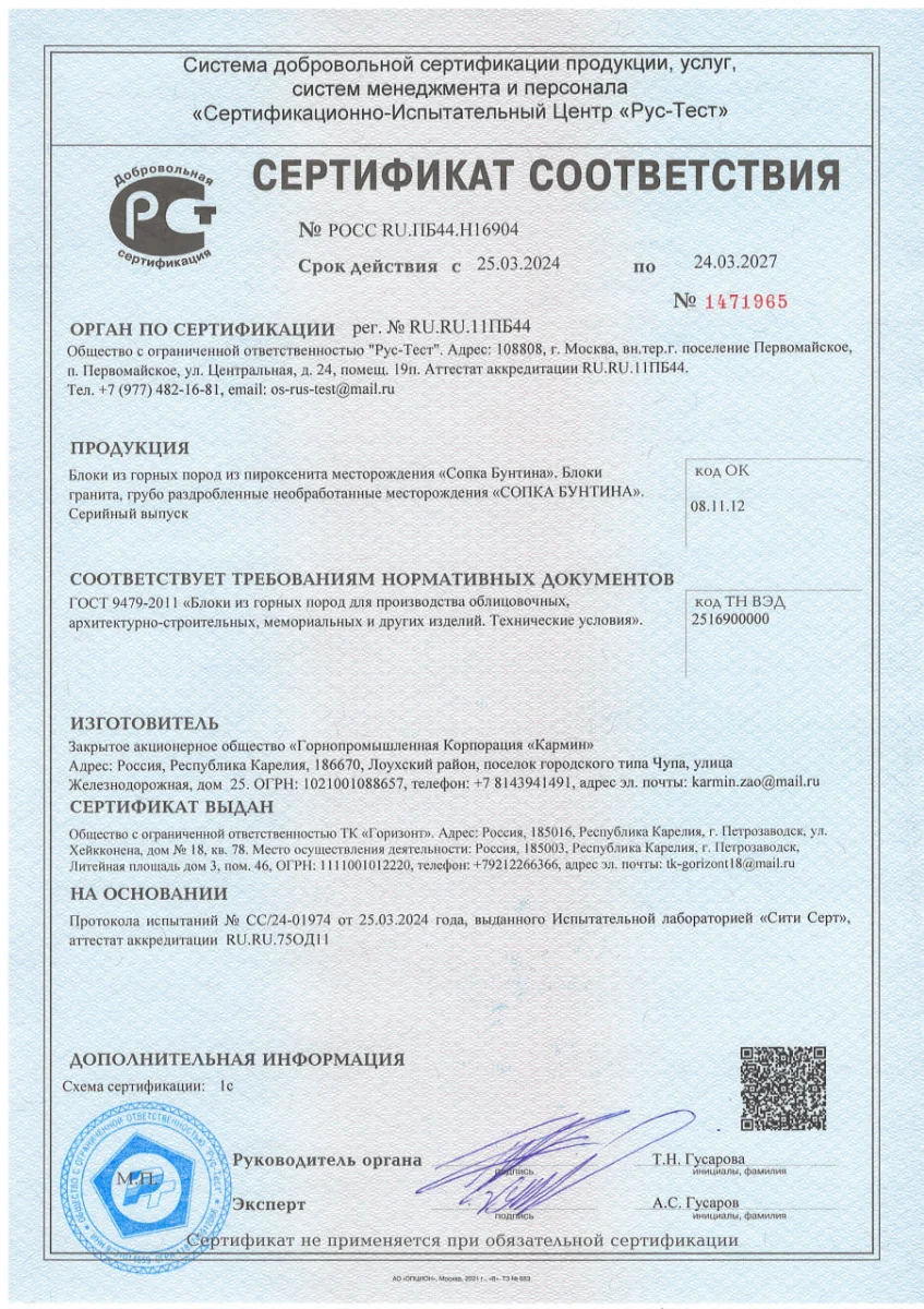 Сертификаты: Гарантия качества и безопасности камня «Мастер Каменев»