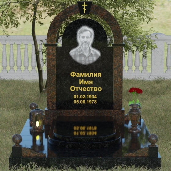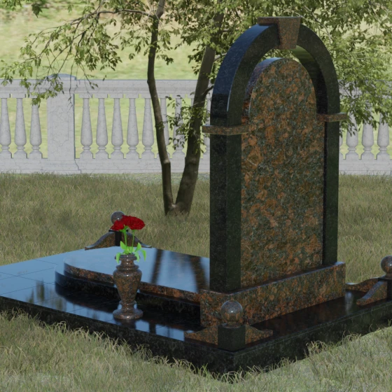 Представленная мемориальная композиция — это триумф архитектурной мысли, воплощенный в благородном камне. В основе дизайна лежит классическая форма арки, которая во многих культурах символизирует небесный свод и торжественный переход в вечность. Центральная стела, имеющая мягкое скругление сверху, обрамлена массивным внешним контуром, создающим эффект глубины и защищенности. Такое многоуровневое решение позволяет играть на визуальных объемах: строгие вертикальные линии боковых колонн уравновешиваются плавным изгибом верхней части, подчеркивая гармонию и покой. Зеркальная полировка лицевых граней доведена до совершенства, в ней отражается мир, напоминая о хрупкой связи между прошлым и настоящим.