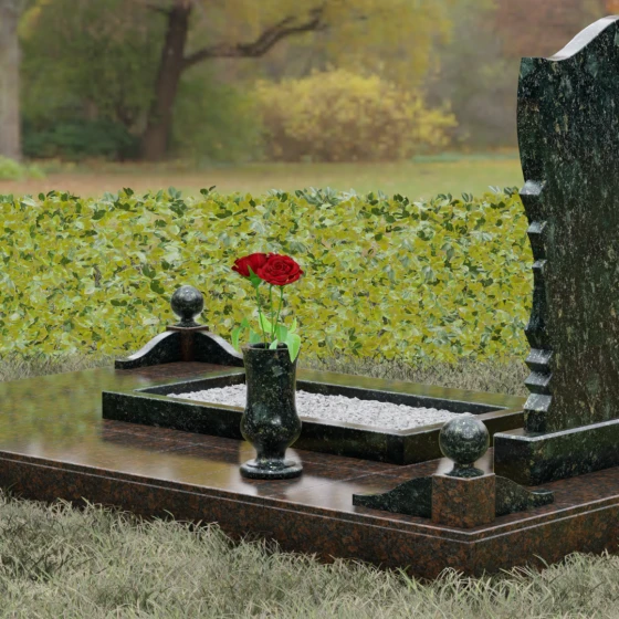 • Надгробная плита: Закрытый тип благоустройства сплошной гранитной плитой не только выглядит эстетично и статусно, но и является максимально практичным решением. Зеркальная поверхность плиты препятствует скоплению влаги и пыли, минимизируя необходимость частого ухода за участком.