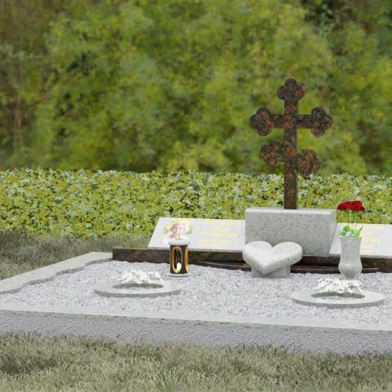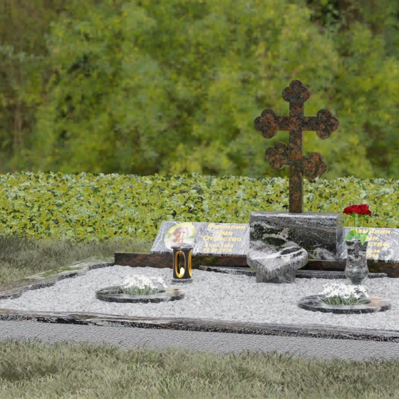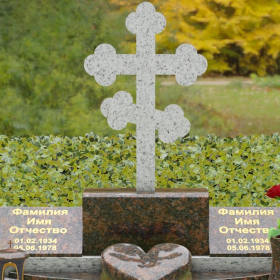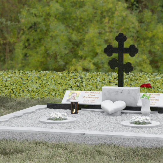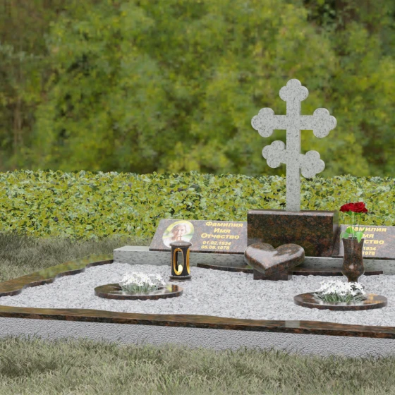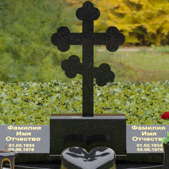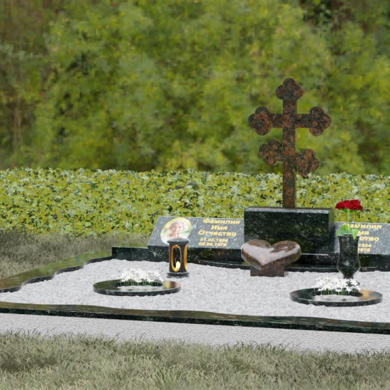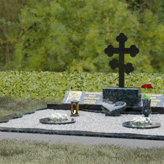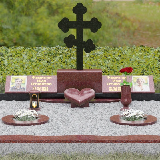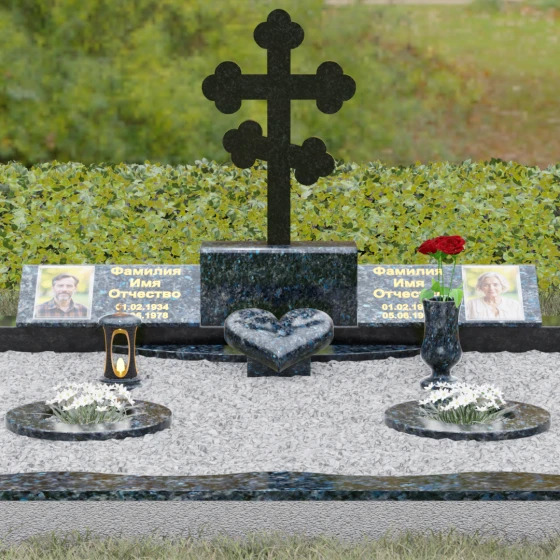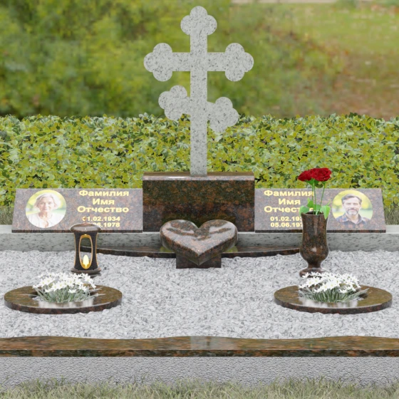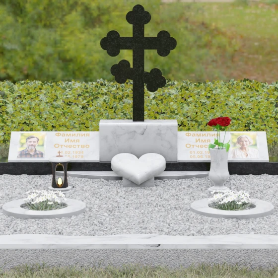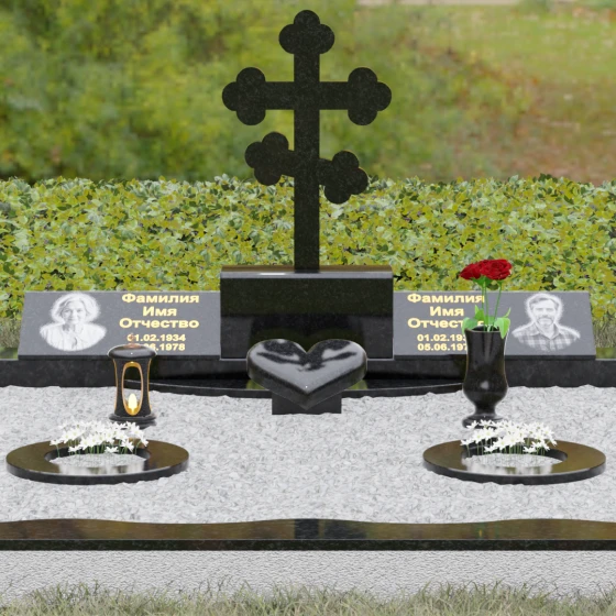 Представленная мемориальная композиция — это монументальный художественный ансамбль, воплощающий идею вечного единения и нерушимой памяти. Центром архитектурного решения выступает величественный православный крест с фигурными навершиями в форме трилистника, установленный на массивный постамент. Перед ним расположено объемное каменное сердце — символ глубокой привязанности и любви, которая переживает века. По обе стороны от центральной оси симметрично размещены две горизонтальные стелы с плавными, волнообразными верхними гранями. Каждая деталь здесь пропитана благородством: зеркальная полировка лицевых поверхностей создает глубокие отражения, контрастируя с матовой фактурой боковых срезов, что придает изделию визуальный объем и торжественность.