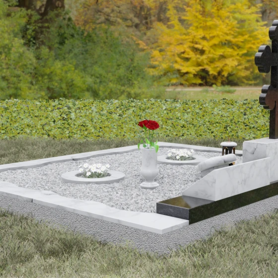 • Надгробное решение: Внутреннее пространство заполнено декоративной светлой крошкой, на фоне которой выделяются два интегрированных круглых цветника. Такое исполнение исключает разрастание сорняков и значительно упрощает уход за участком.