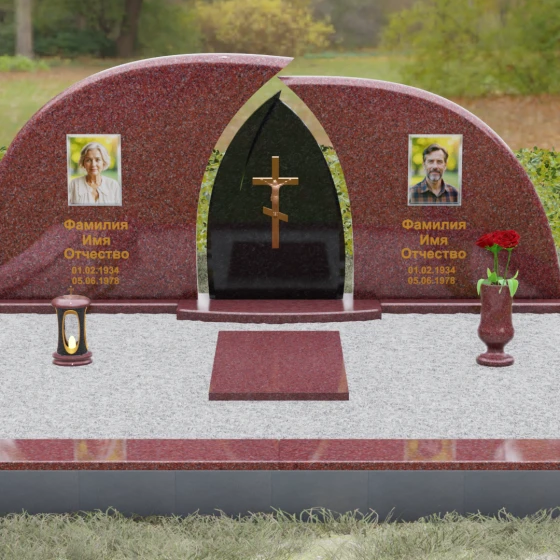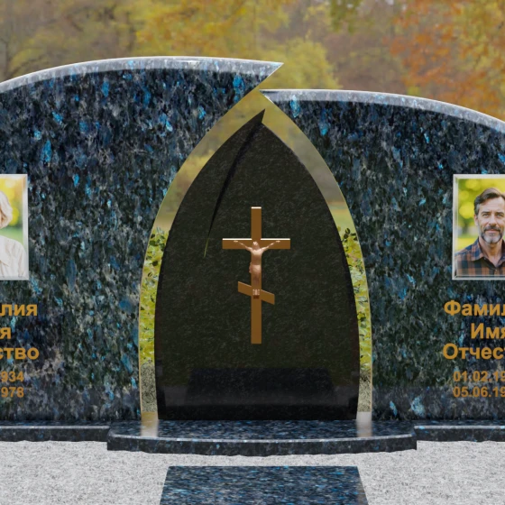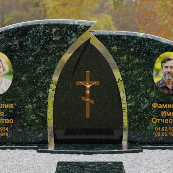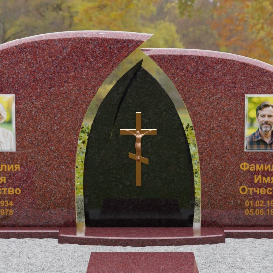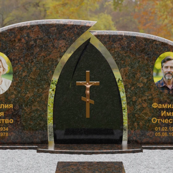 Оформление: Форма стелы идеально подходит для парных захоронений. Благодаря большой полезной площади полированных плит, портреты можно расположить симметрично, используя как классическую гравировку, так и цветную фотокерамику. Золоченая гравировка ФИО будет особенно эффектно смотреться на темном фоне, перекликаясь с цветом центрального креста и создавая цельный, дорогой образ.