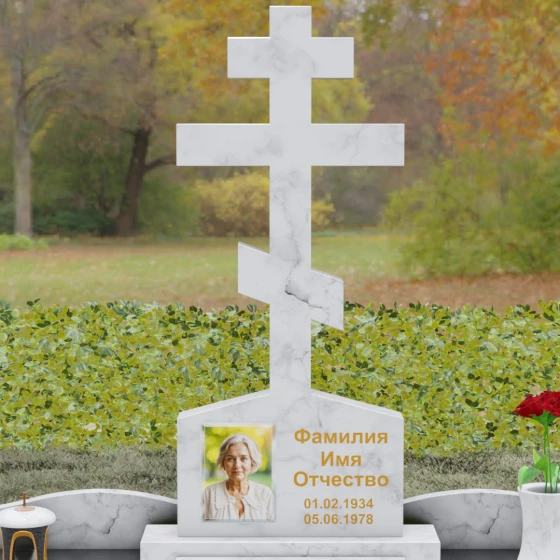 Центральной доминантой композиции выступает величественный православный крест, интегрированный в широкое основание стелы. Это не просто плоский силуэт, а сложная объемная структура с акцентированными гранями. Мастерская обработка камня позволяет добиться потрясающей игры света и тени на полированных поверхностях: зеркальный блеск фронтальных плоскостей контрастирует с четкими линиями фасок, создавая эффект глубины и монументальности. Нижняя часть стелы имеет изящное навершие в форме пологой арки, что смягчает строгость вертикальных линий и придает конструкции архитектурную завершенность. Портрет и надписи, нанесенные на основное полотно, выглядят органично, а использование золоченой гравировки подчеркивает статусность мемориала.