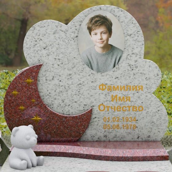 Данная мемориальная композиция — это воплощение нежности, глубокой любви и тихой грусти, застывшей в благородном камне. Выбор такой формы продиктован желанием выразить самые светлые чувства к ушедшему близкому человеку. Силуэт стелы, выполненный в виде мягкого, кучевого облака с плавными, округлыми очертаниями, символизирует покой и вечную жизнь души в небесных сферах. Асимметричная геометрия придает монументу индивидуальность, выделяя его среди строгих прямоугольных форм, и создает ощущение легкости, несмотря на внушительный вес натурального гранита. Особый акцент сделан на игре фактур и цветов: основная часть монумента из темного камня гармонично сочетается со вставкой из светлого гранита в форме изящного полумесяца. На этом светлом фоне выгравированы лаконичные золотые звезды, которые словно освещают путь памяти через десятилетия.