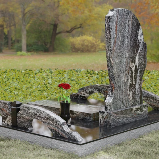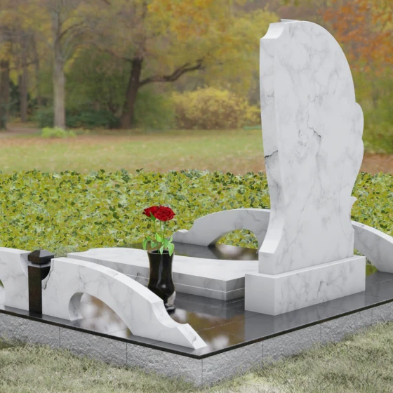 Главным акцентом этой композиции является виртуозная работа с формой и объемом. Левая грань мемориала представляет собой сложную многоуровневую резьбу. В основании берет начало изящная фигура птицы — голубя, чье оперение плавно переходит в мощное, стремящееся вверх крыло. Филигранная проработка каждой борозды создает динамичный ритм, словно застывшее в камне движение воздуха. Гранитный монумент построен на выразительном контрасте: основное полотно камня имеет безупречную зеркальную полировку, в которой отражается небо, в то время как резные элементы крыла и птицы выполнены с мягким матовым финишем. Эта разница фактур подчеркивает глубину барельефа, делая его осязаемым и объемным под любым углом освещения. Плавные, волнообразные линии верхушки лишают памятник суровости, придавая ему женственные, защищающие черты.