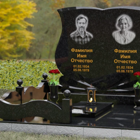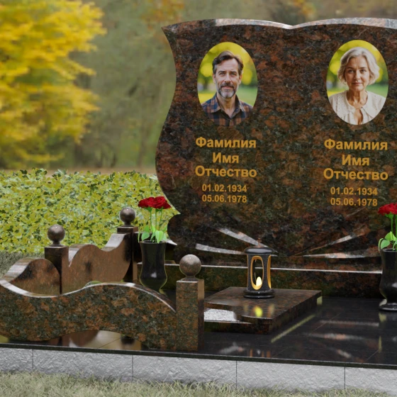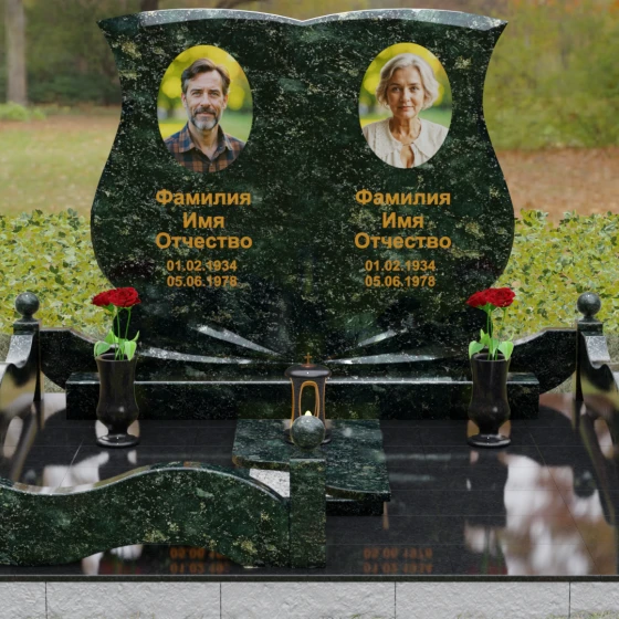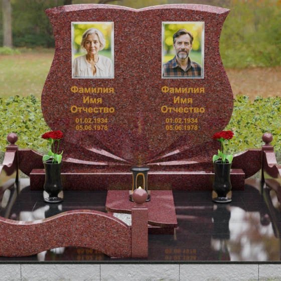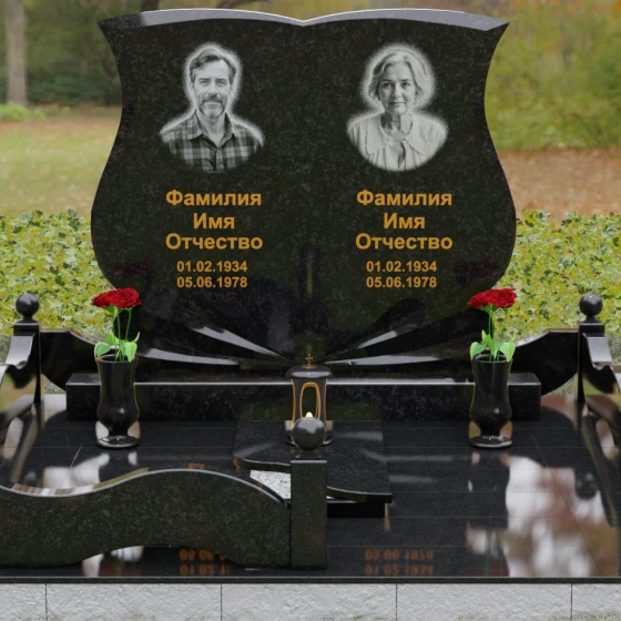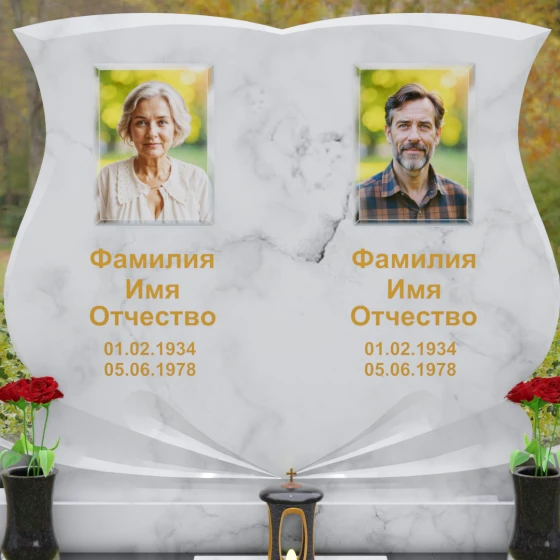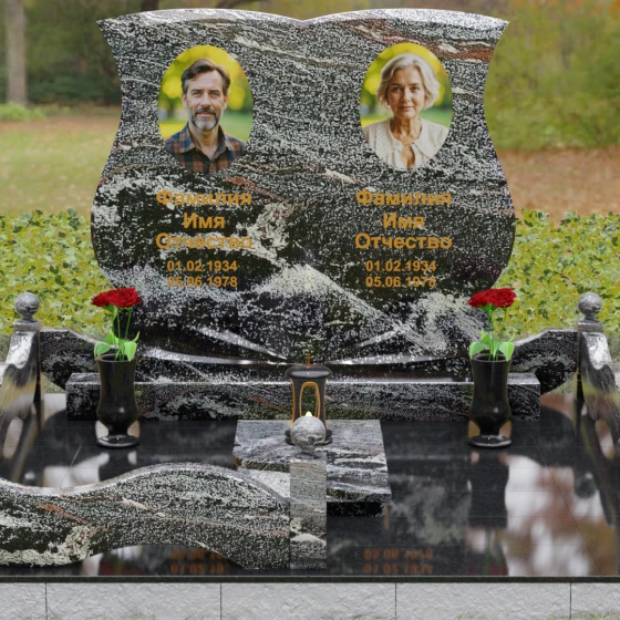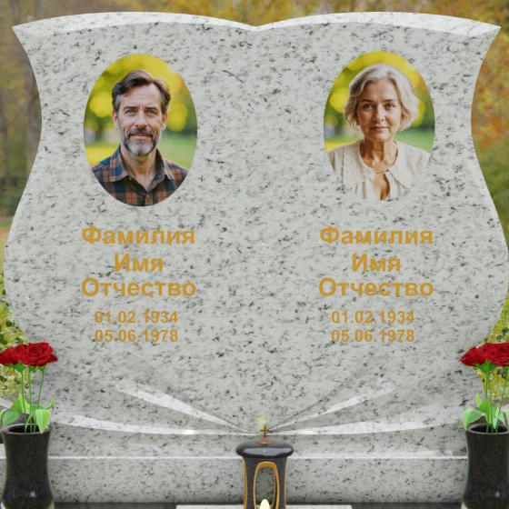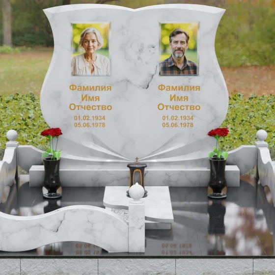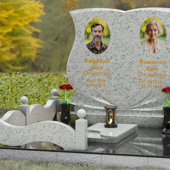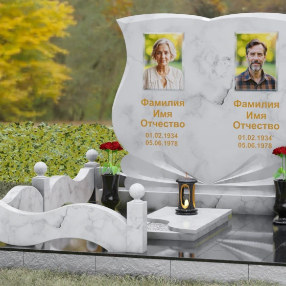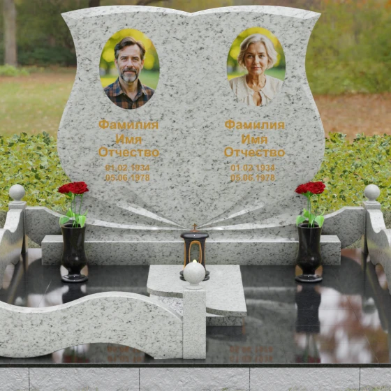 Кому подойдет: Эта модель разработана специально для парных захоронений, становясь достойным символом неразрывной связи. Она идеально подходит для увековечивания памяти родителей, супружеских пар или близких родственников. Возможность исполнения в светлых тонах (Мансуровский гранит или мрамор Тассо) придаст мемориалу возвышенную легкость, тогда как темные виды гранита подчеркнут статусность и строгую торжественность места упокоения. Благодаря своей сложной геометрии и обилию декоративных элементов, комплекс выглядит дорого и самодостаточно в любых условиях освещения.
