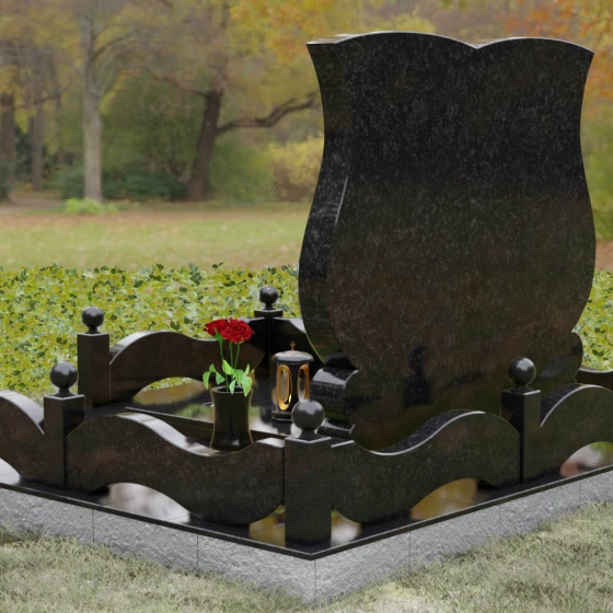Данная модель не ограничивается одной лишь стелой — это законченное архитектурное решение. Памятник установлен на массивный гранитный цоколь, обеспечивающий идеальную горизонталь и устойчивость всей конструкции. Вместо открытого цветника здесь используется сплошная надгробная плита, что не только придает участку эстетическую завершенность, но и является практичным решением для сохранения чистоты. Периметр захоронения оформлен декоративным каменным бордюром с фигурными столбиками, на которых установлены идеально отполированные шары. В композицию гармонично интегрированы парные вазы из того же вида камня и центральная лампада, создавая единое сакральное пространство.