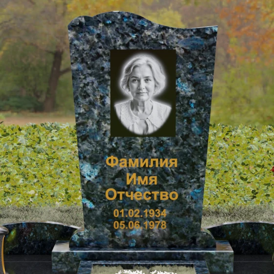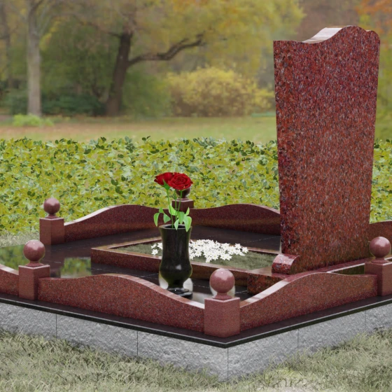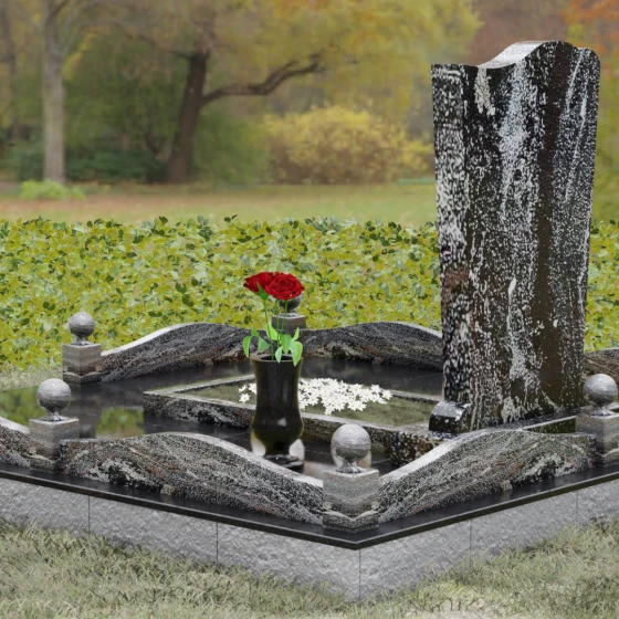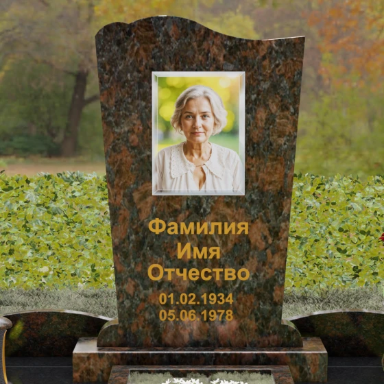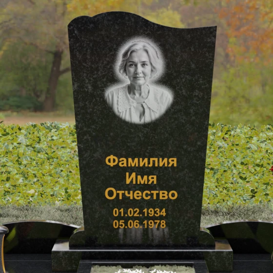 Стела этого ансамбля (Артикул 150) отличается изысканной асимметричной геометрией, которая выделяет её на фоне классических решений. Верхняя грань изделия выполнена в форме плавной, ниспадающей волны, напоминающей движение ткани или изгиб небесного свода. Этот мягкий рез по камню создает выразительный силуэт, который гармонирует с вертикальными боковыми гранями, слегка сужающимися к основанию. Особое внимание уделено фактуре: идеально гладкая зеркальная полировка лицевой поверхности контрастирует с четкими, мастерски обработанными фасками. Игра света на полированных гранях подчеркивает благородство природного материала, а глубина блеска создает эффект бесконечности, в которой отражается небо, соединяя земную память с вечностью.