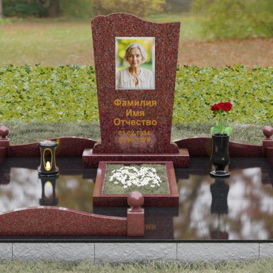 Благоустройство участка выполнено с учетом высших стандартов мемориальной архитектуры. Ритуальное изделие установлено на массивный гранитный цоколь, который служит надежным фундаментом и визуально приподнимает комплекс над уровнем земли. По периметру установлены строгие столбики, увенчанные идеально отполированными каменными шарами — классическим символом мироздания и завершенности пути. Внутренняя площадь полностью облицована гранитными плитами мощения, что исключает прорастание травы и гарантирует безупречный вид комплекса десятилетиями. Композицию завершают функциональные и эстетичные аксессуары: точеная гранитная ваза для живых цветов и закрытая лампада, выполненная в единой стилистике с основным надгробием.