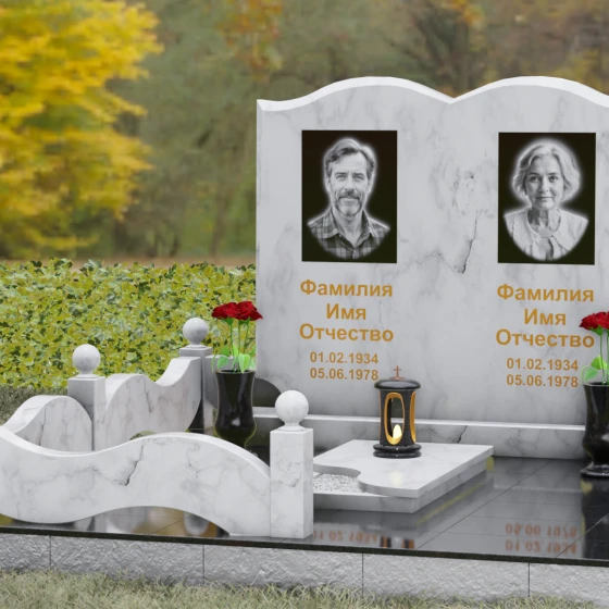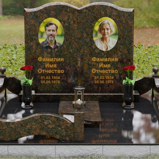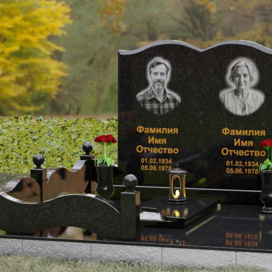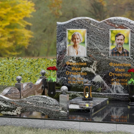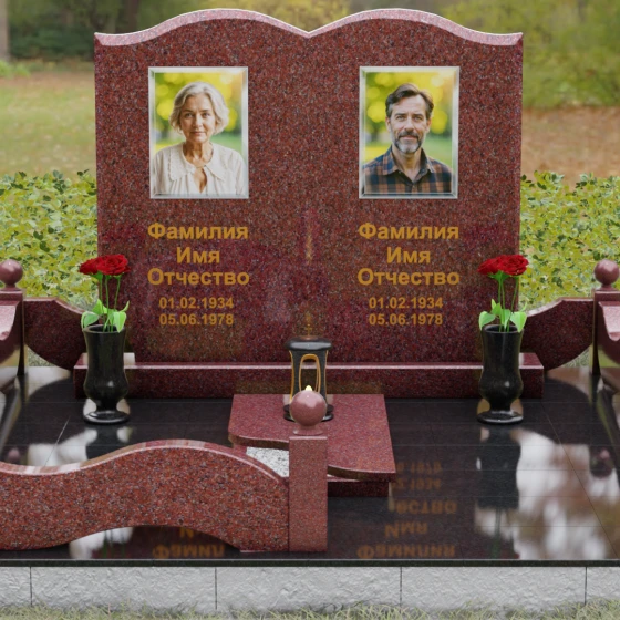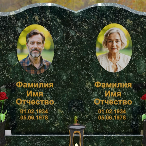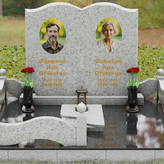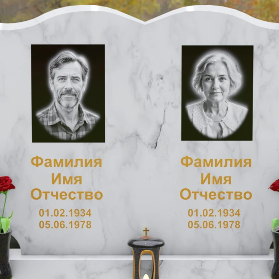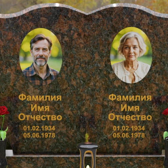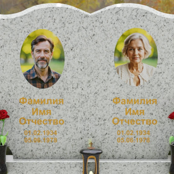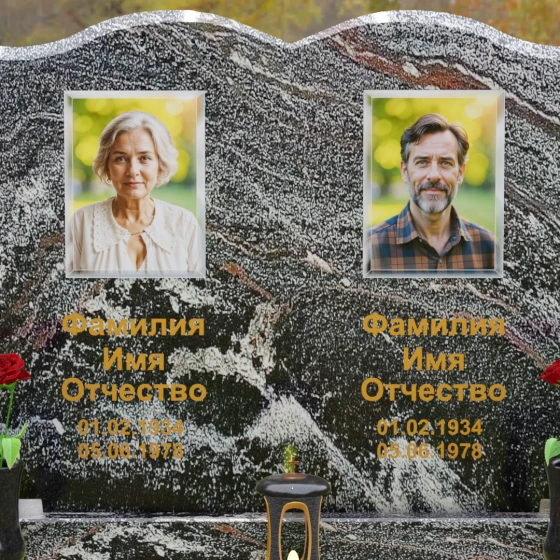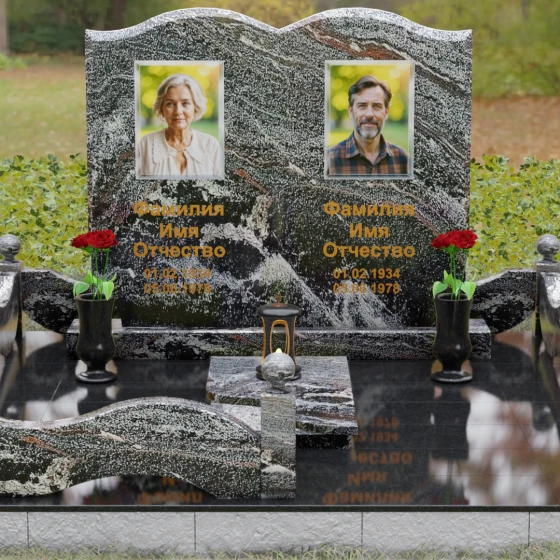 Оформление: Учитывая форму раскрытой книги, для этой модели идеально подходит гравировка ФИО и дат с покрытием сусальным золотом или краской «под бронзу». Это создает эффект старинного фолианта. Портреты могут быть выполнены как в технике лазерной гравировки с высокой детализацией (на темных сортах камня), так и в виде керамических овалов, врезанных в толщу гранита, что особенно эффектно смотрится на светлом мраморе Тассо или Мансуровском граните.