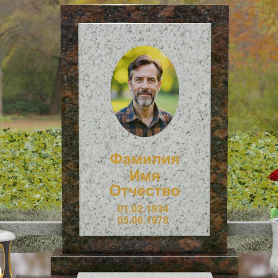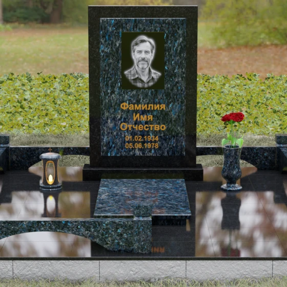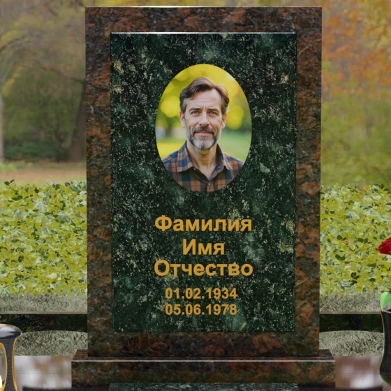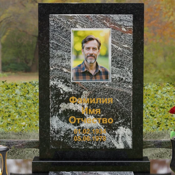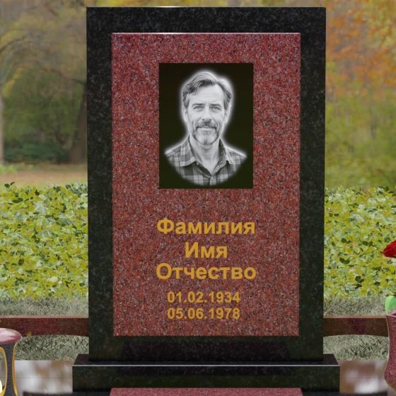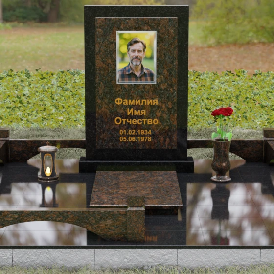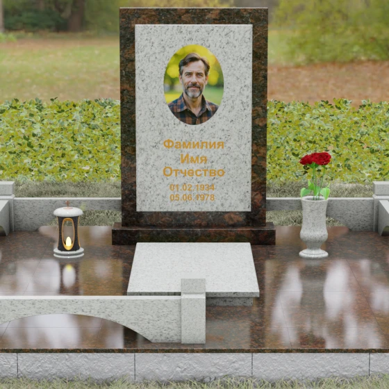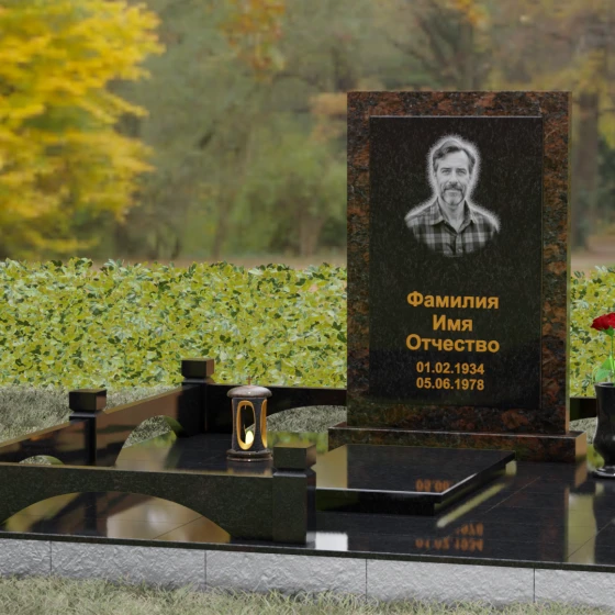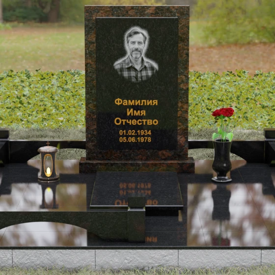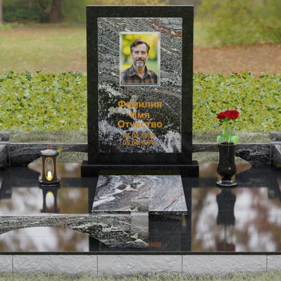 Центральным элементом ансамбля является величественная вертикальная стела, выполненная по принципу "камня в камне". Внешний массивный контур, напоминающий классический портал или торжественную раму, надежно удерживает внутреннюю плиту, создавая эффект глубины и защищенности. Геометрия изделия строга и лаконична: прямые углы и четкие фаски подчеркивают мужественность и твердость характера, в то время как безупречная зеркальная полировка лицевых поверхностей играет на контрасте с природным рисунком камня. Многоуровневость конструкции придает обелиску объем, делая его доминантой всего захоронения.