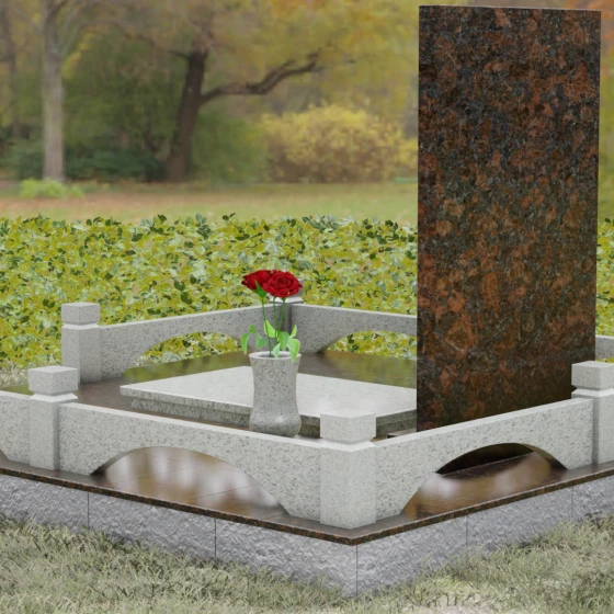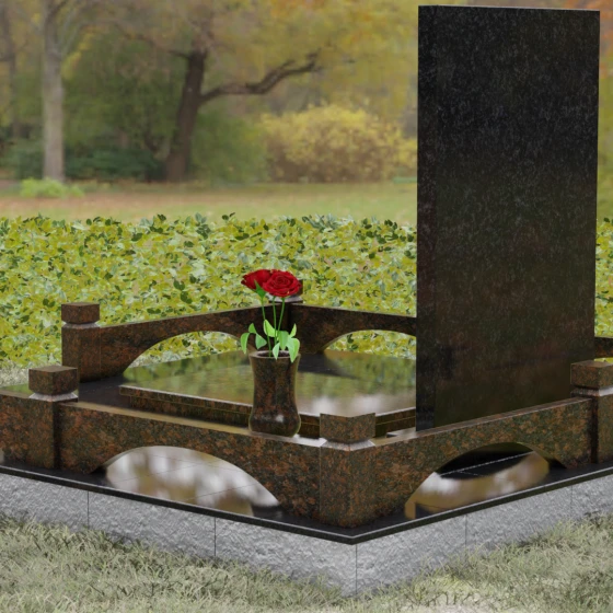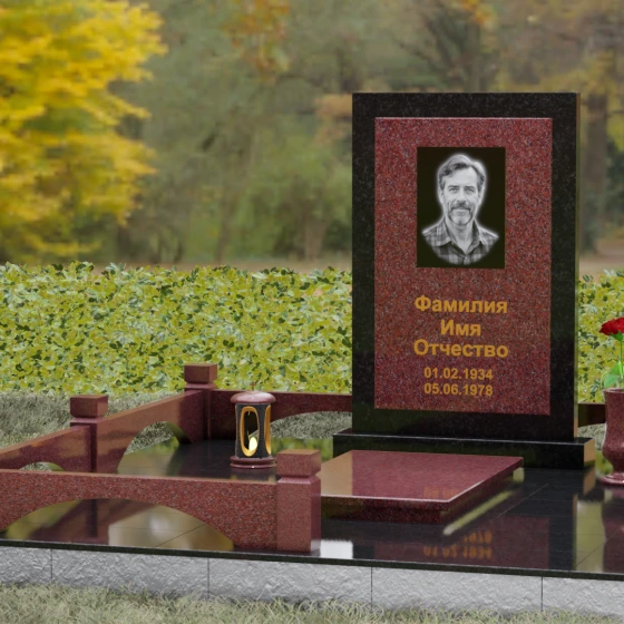Особое внимание уделено благоустройству прилегающей территории. Основание надгробия покоится на массивном гранитном подиуме, который переходит в закрытую систему мощения. Использование сплошных плит вместо открытого грунта не только придает участку эстетическую завершенность, но и гарантирует идеальный порядок на долгие годы. Периметр обозначен строгим каменным цоколем с акцентными столбиками, создающими ощущение приватности и сакральности пространства. Композицию дополняют функциональные элементы декора: изящная каменная ваза для живых цветов и закрытая лампада, в которой огонь памяти будет защищен от любых капризов стихии.
