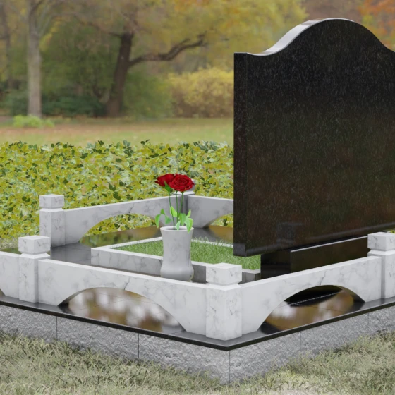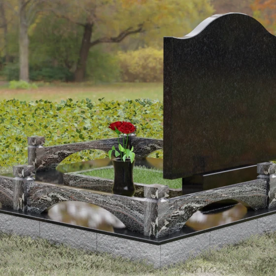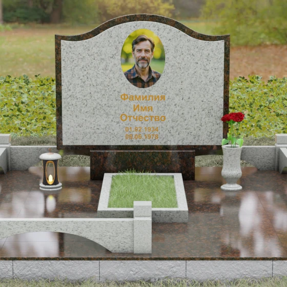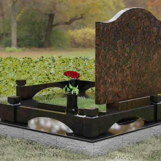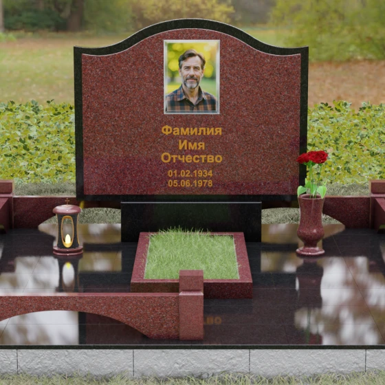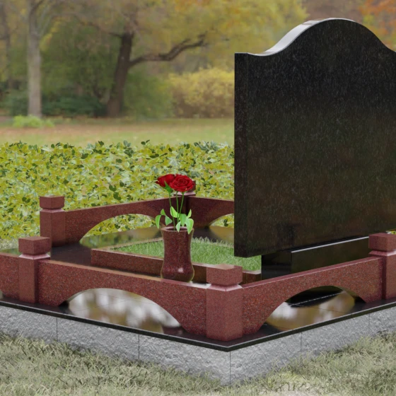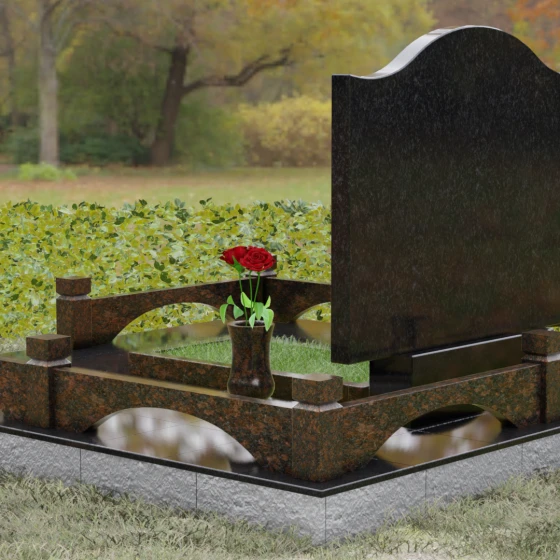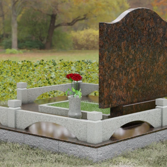 • Законченность ансамбля: В состав комплекса входит массивный гранитный цоколь с угловыми столбиками, который четко очерчивает границы участка, придавая ему статусность. Цельнокроеная надгробная плита с аккуратным вырезом под цветник обеспечивает эстетичный вид и минимизирует необходимость сложного ухода.