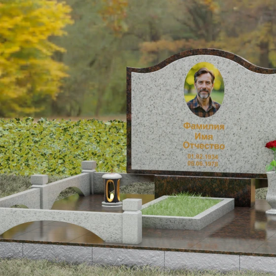 • Символический декор: Композиция дополнена функциональными элементами из камня — изящной вазой для живых цветов и закрытой лампадой. Лампада, установленная на постаменте, символизирует «вечный свет» души и позволяет зажечь поминальный огонь, защищенный от ветра.
