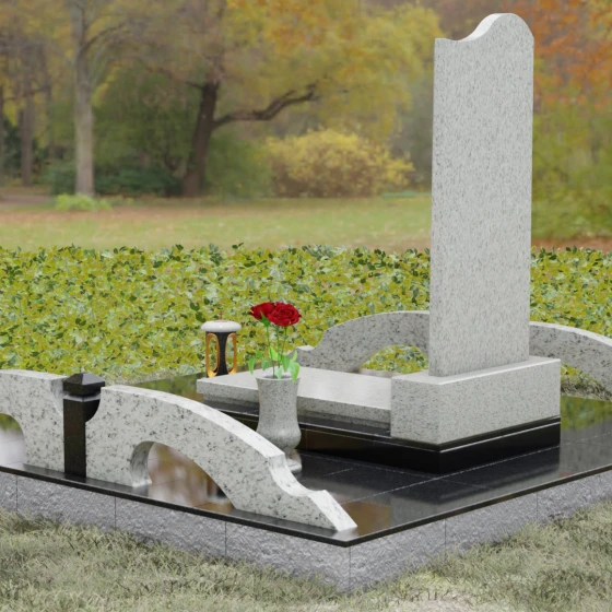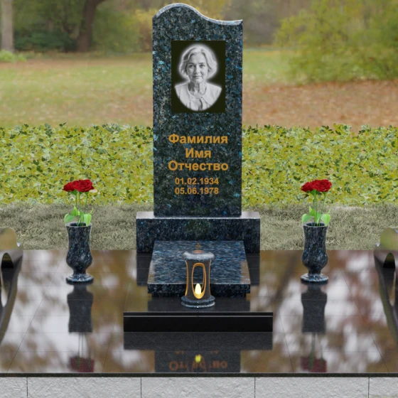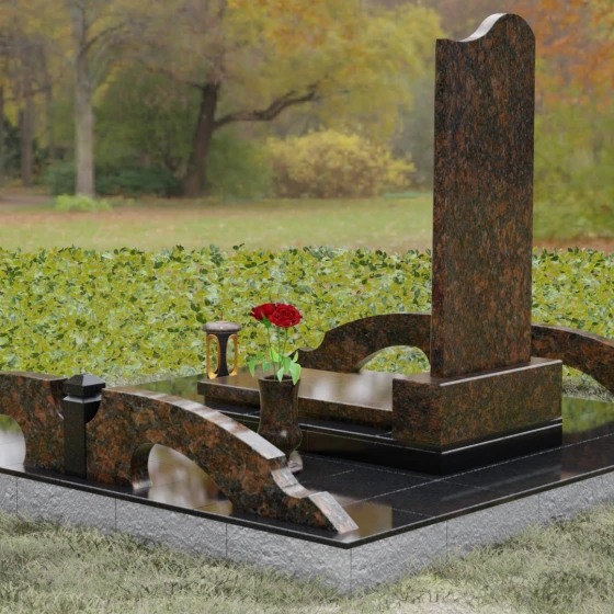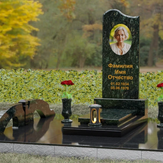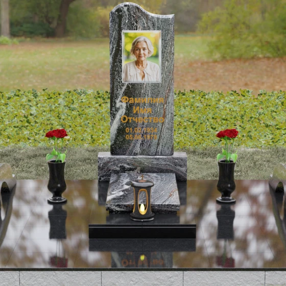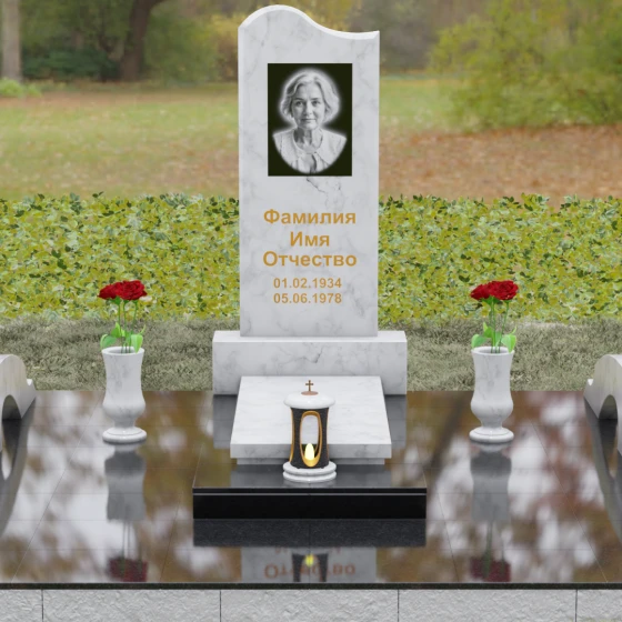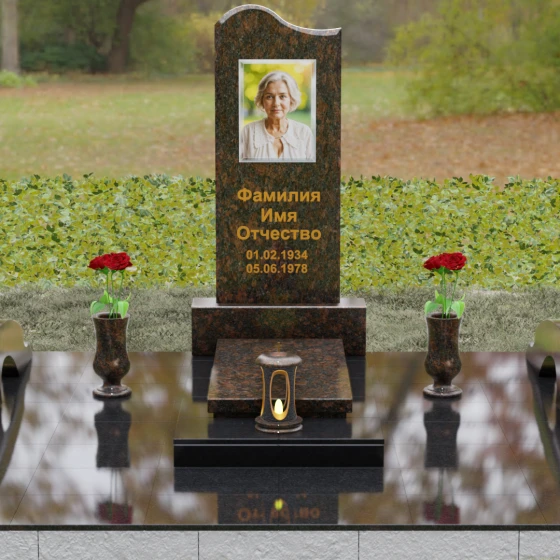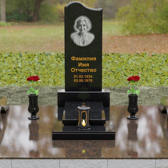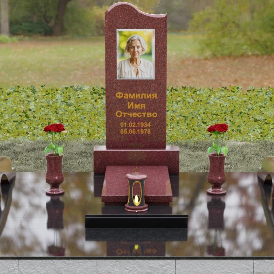 Данная мемориальная композиция предполагает целостное оформление участка. Стела устанавливается на массивный каменный постамент, который служит надежным фундаментом и придает всей конструкции величественность. В едином ансамбле с основным монументом могут быть выполнены изящные вазы, расположенные по бокам. Эти элементы декора, выточенные из того же благородного материала, позволяют всегда содержать место памяти в порядке, украшая его живыми цветами. Использование цельных каменных элементов в основании исключает прорастание сорной травы и значительно упрощает уход, сохраняя первозданный вид комплекса на десятилетия.