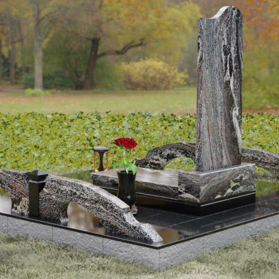 Главной отличительной чертой данной модели является её изысканная и асимметричная геометрия. Верхушка стелы выполнена в виде плавной, ниспадающей волны, которая придает массивному камню удивительную легкость и динамику. Правый верхний угол акцентирован изящным изгибом, напоминающим движение морского прибоя или лепесток экзотического цветка. Края монумента обработаны с безупречной точностью: фаски мягко скругляют строгие линии, создавая ощущение завершенности и безопасности. Особое внимание уделено фактуре — зеркальная полировка лицевой стороны создает глубокий, почти мистический блеск, в котором отражается небо, в то время как боковые грани сохраняют строгость и монументальность натуральной породы.